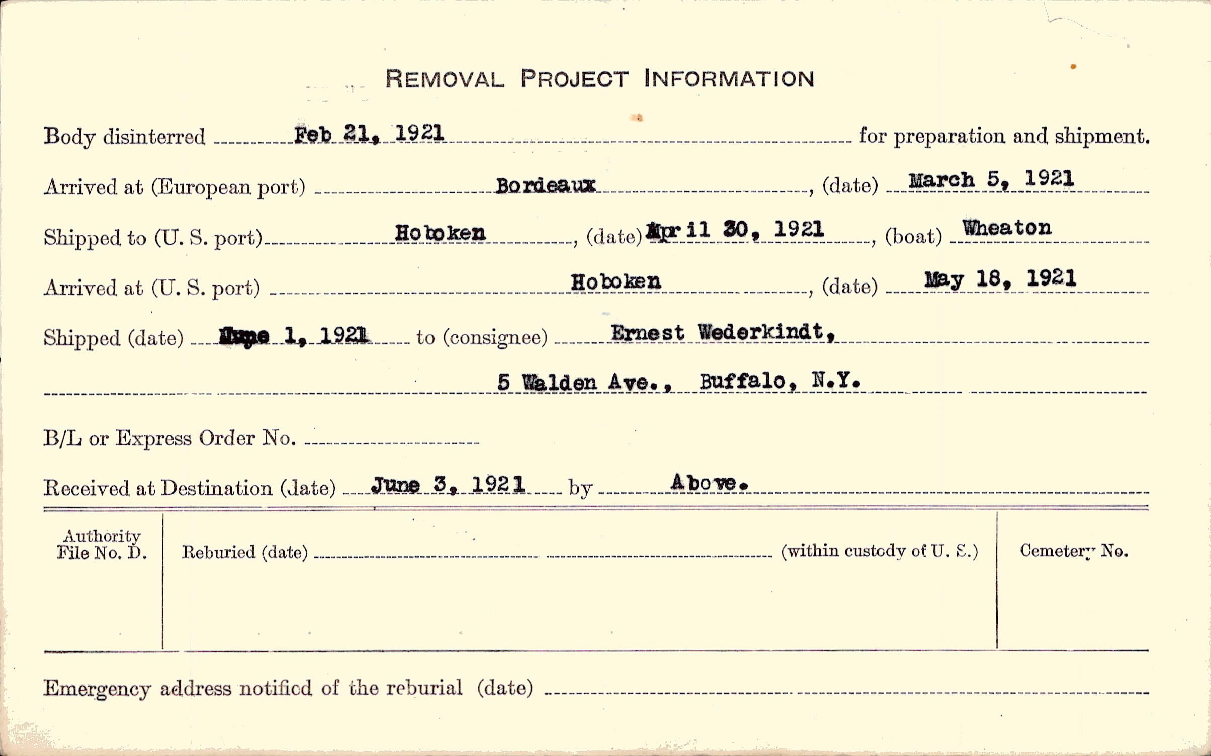 to Ernest Wederkindt, 5 Walden Ave., Buffalo, N.Y.