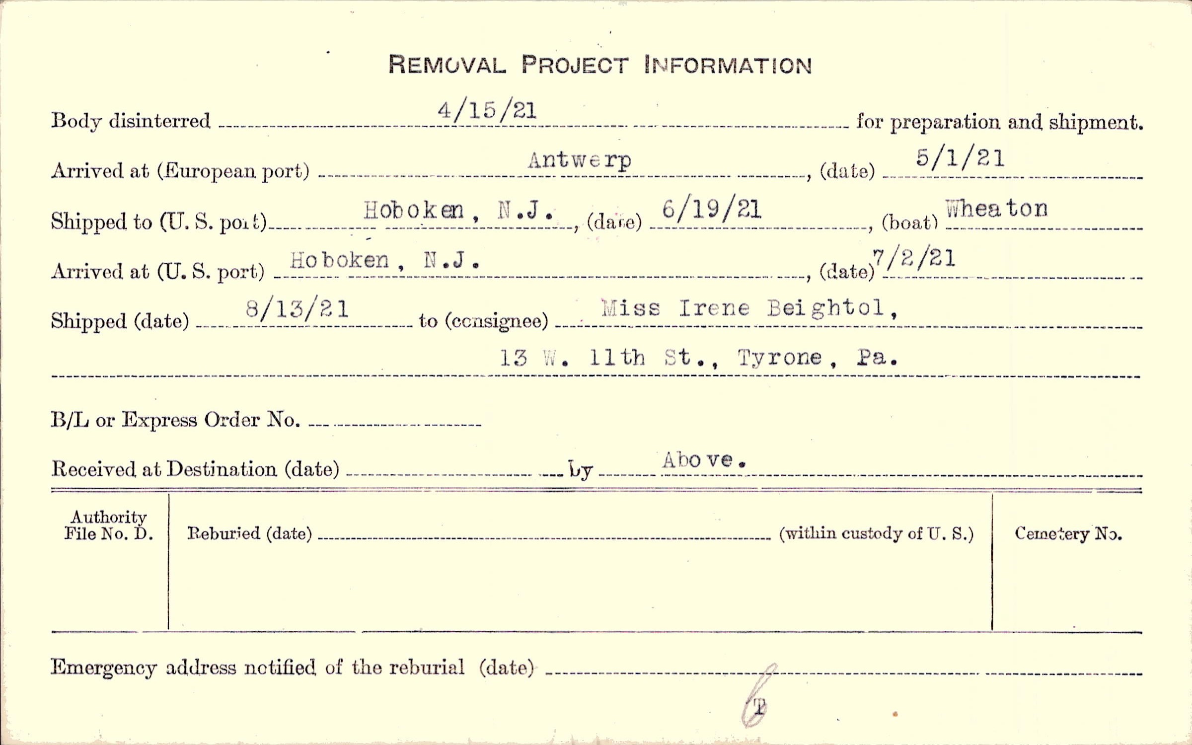 to Miss Irene Beightol, 13 W. 11th St., Tyrone, Pa.