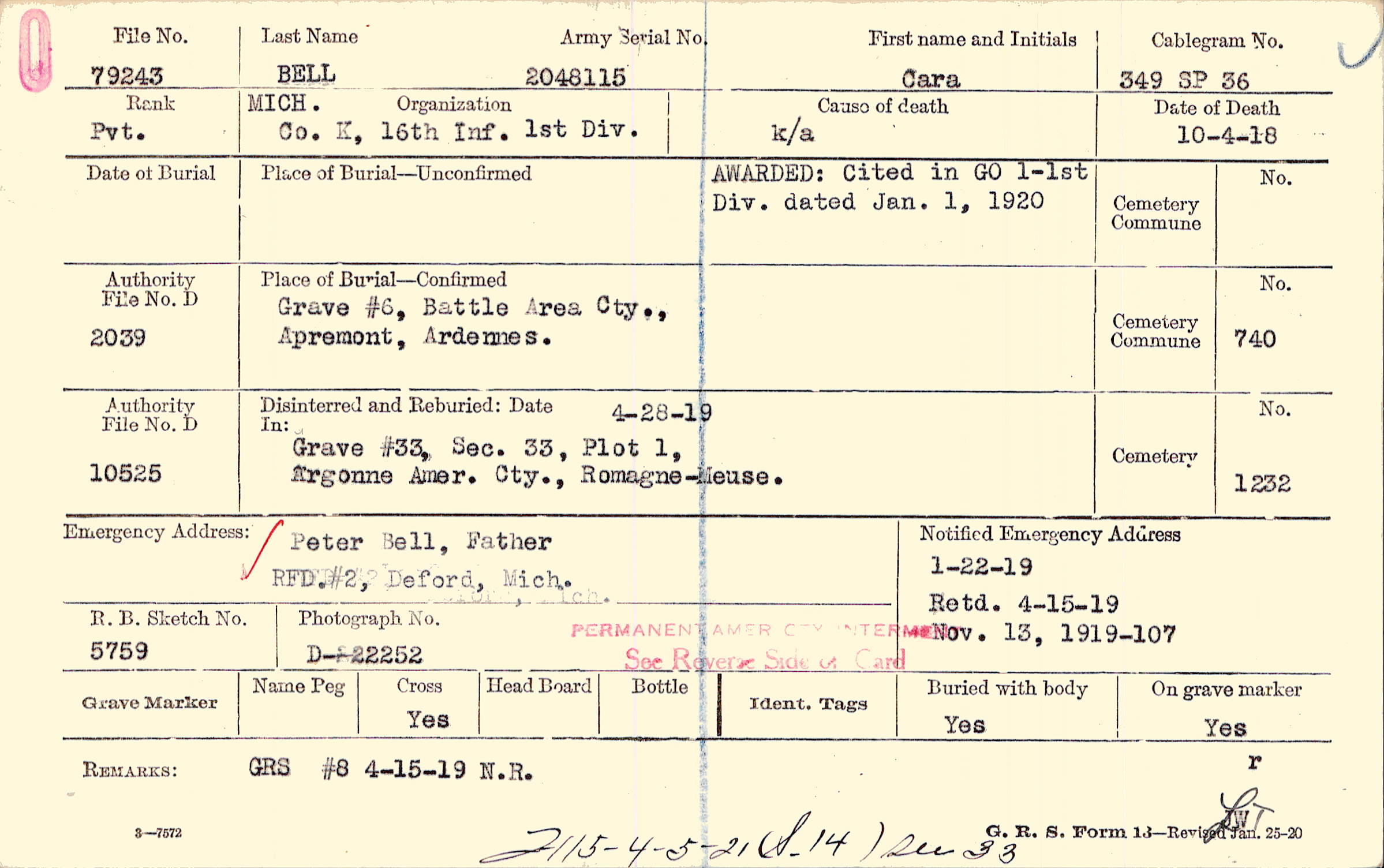 1/22/1919, Retd 4/15/1919, Nov 13, 1919 Form 107: