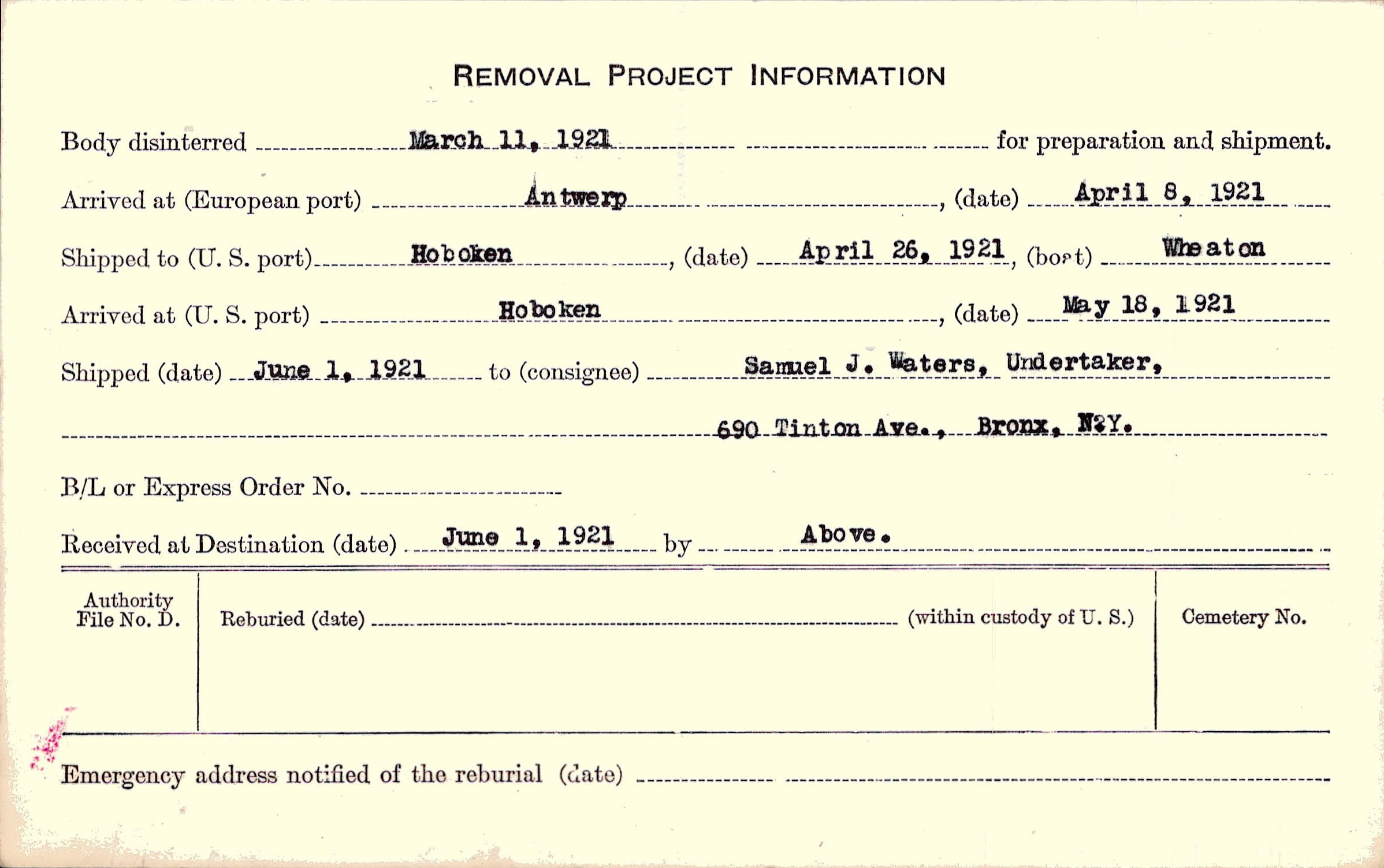 to Samuel J. Waters, Undertaker, 690 Tinton Ave., Bronx, N. Y.