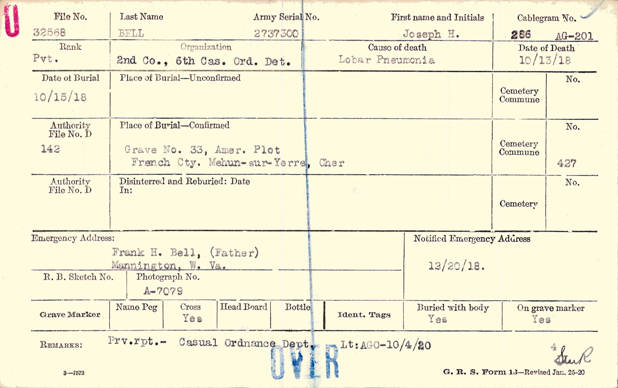 Grave 33, Amer. Plot., French Cty. Mehun-sur-Yerre, Cher