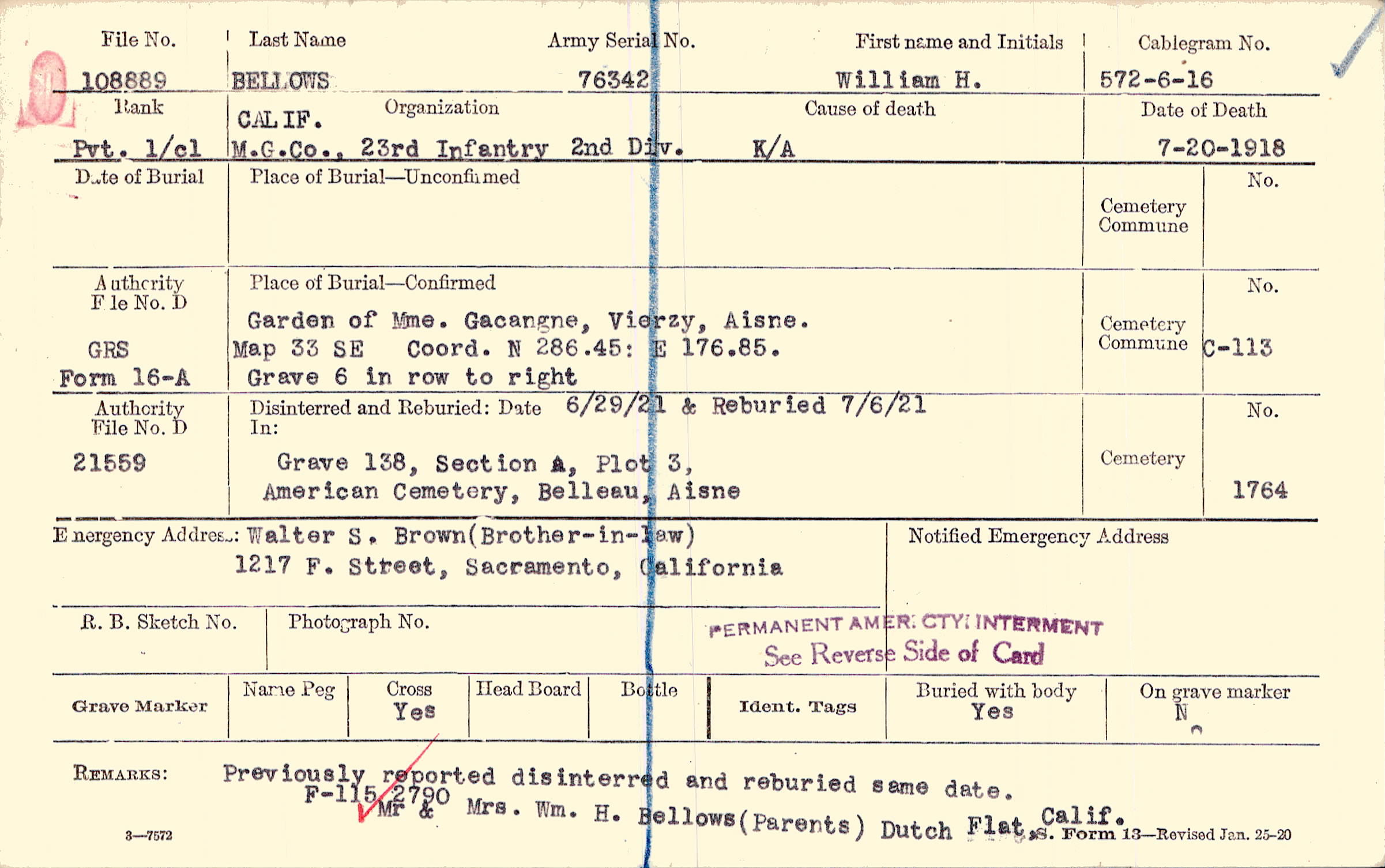 Previously reported disinterred and reburied same date. Mr & Mrs. Wm. H. Bellows (Parents) Dutch Flat, Calif., F-115 2790