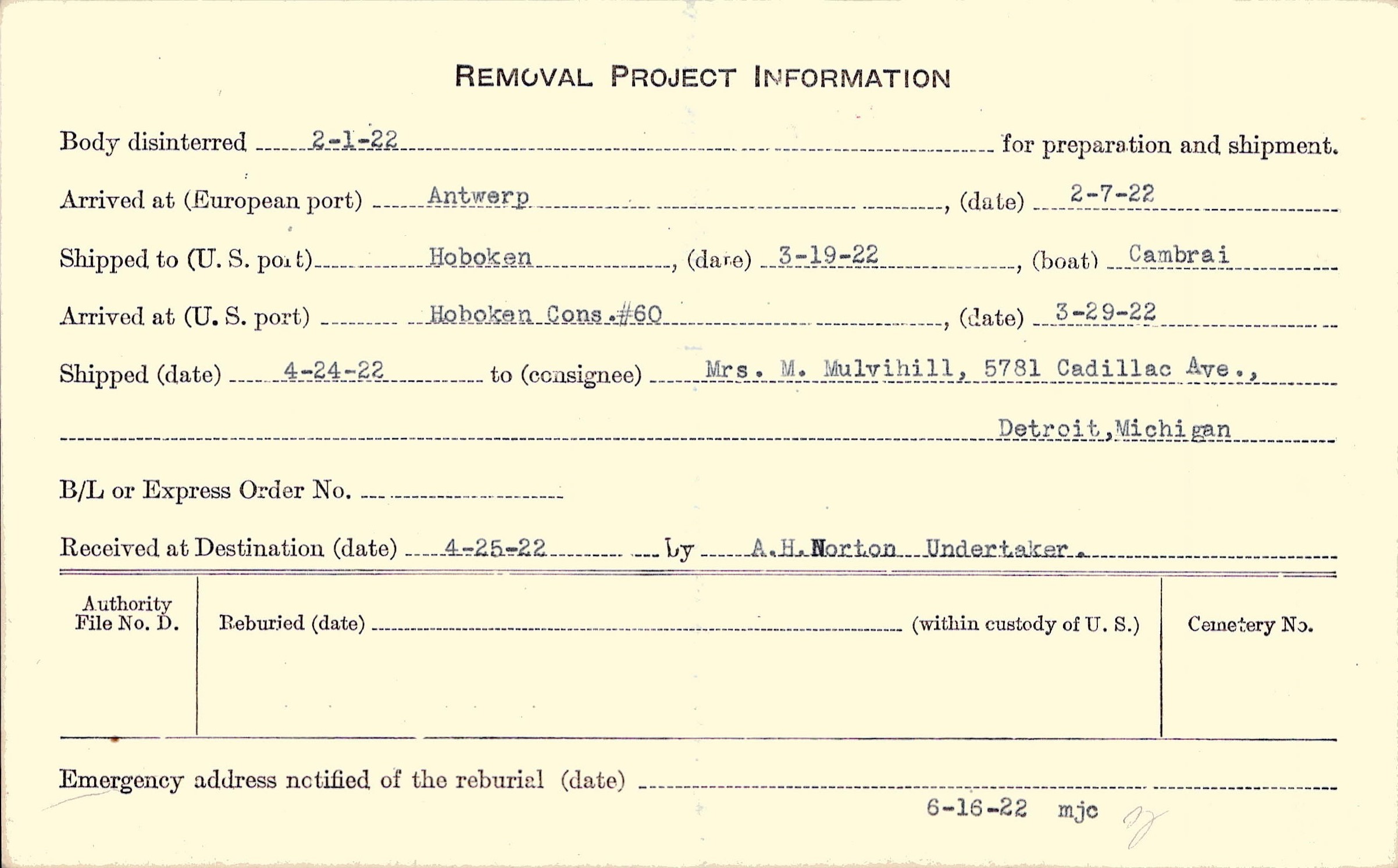 Body disinterred 2/1/1922 for preparation and shipment.