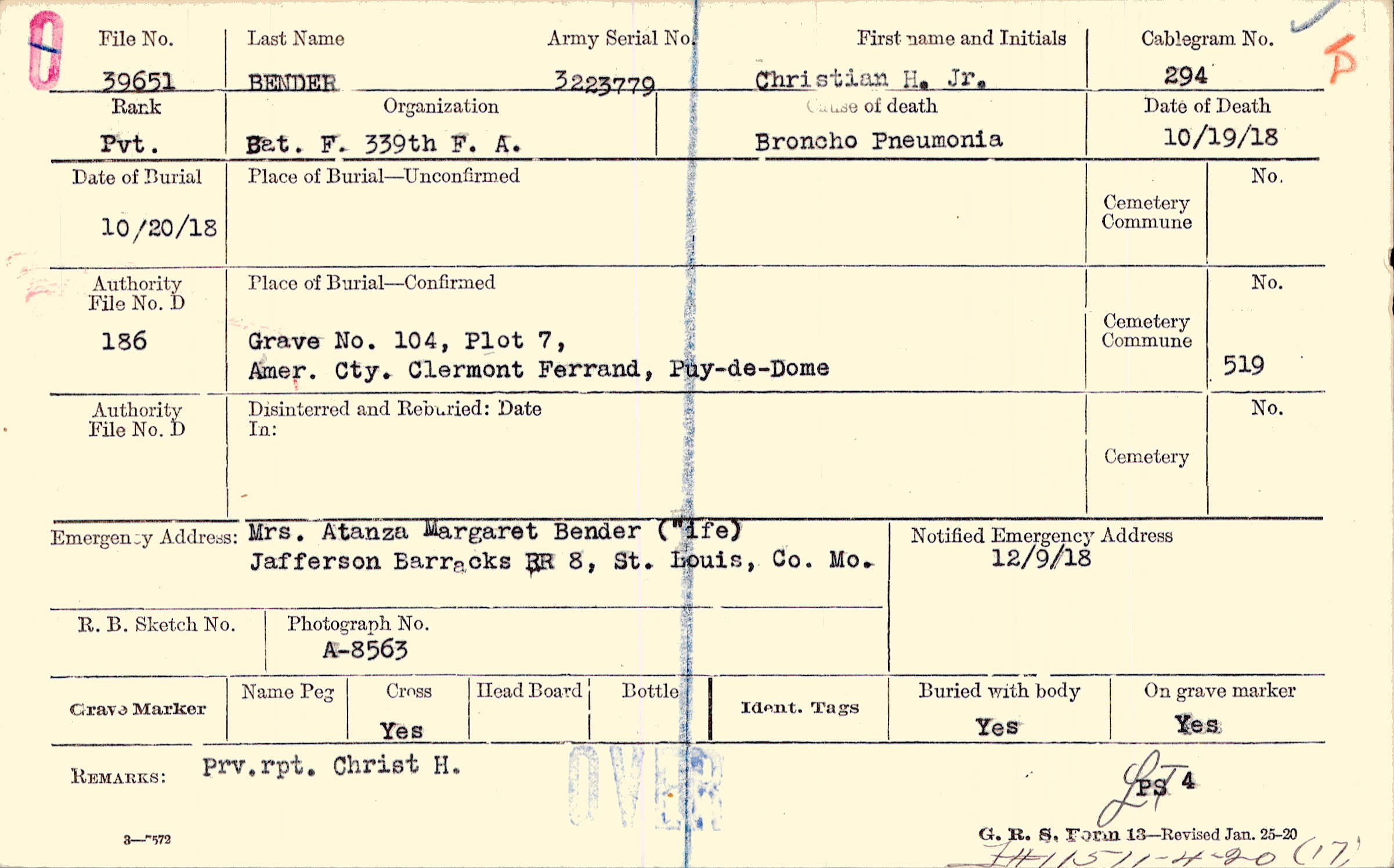Mrs. Atanza Margaret Bender (Wife), Jafferson Barracks Rr 8, St Louis, Co. Mo.