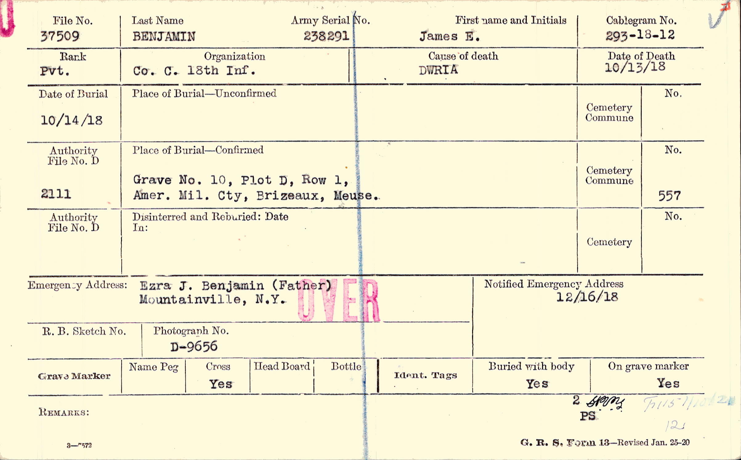 Grave 10, Plot D, Row 1, Amer. Mil., Cty, Brizeaux, Meuse.