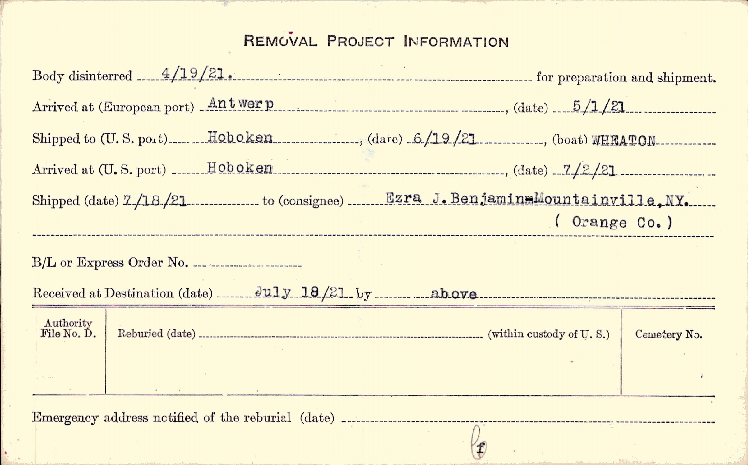 Body disinterred 4/19/1921 for preparation and shipment.