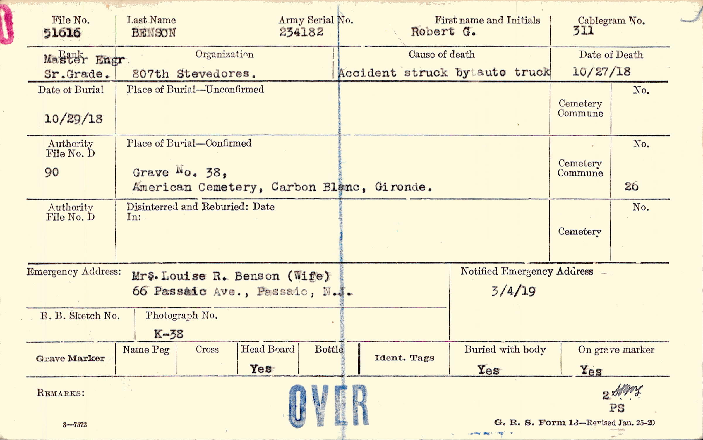 Mrs. Louise R. Benson (Wife), 66 Passaic Ave., Passaic, N.J.