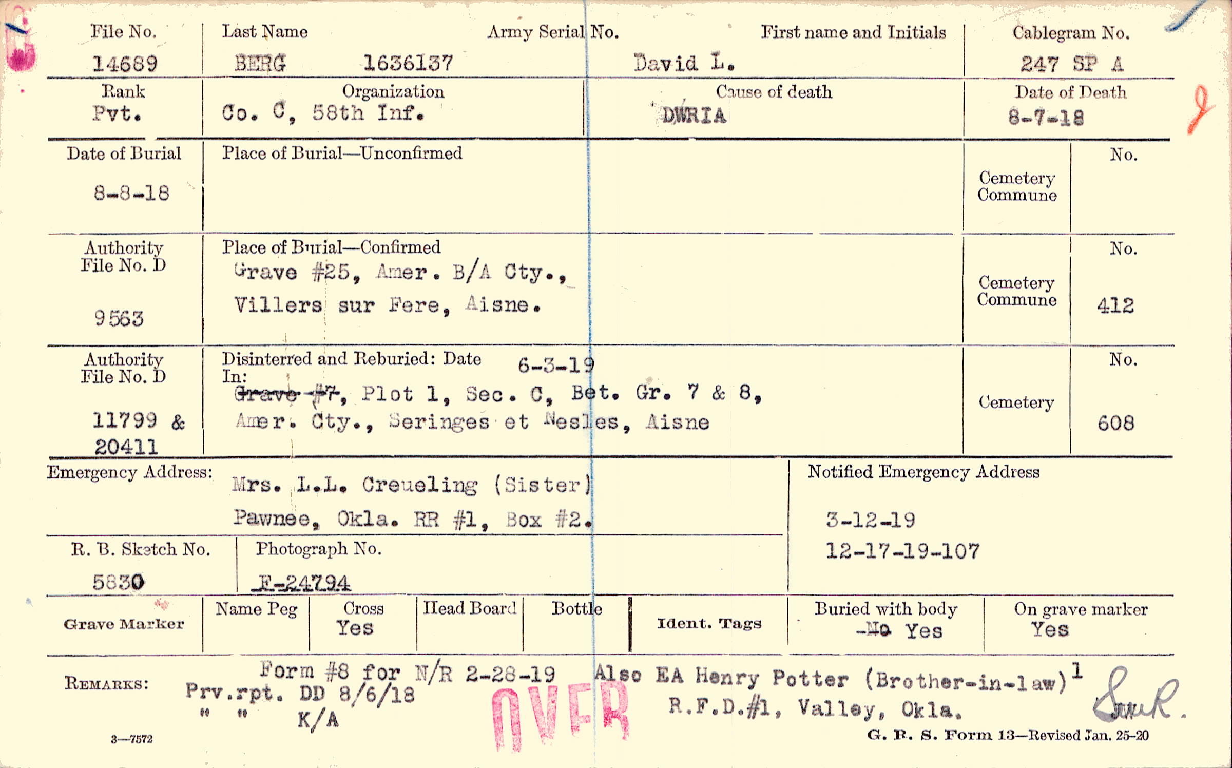 Mrs. L.L. Creueling (Sister), Pawnee, Okla. RR #1, Box #2.