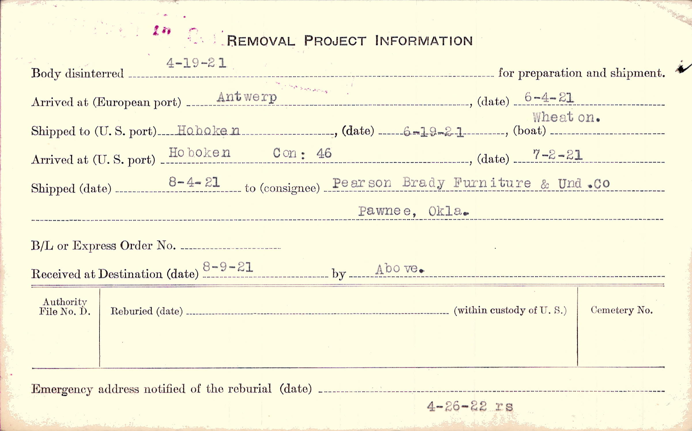to Pearson Brady Furniture & Und. Co, Pawnee, Okla.