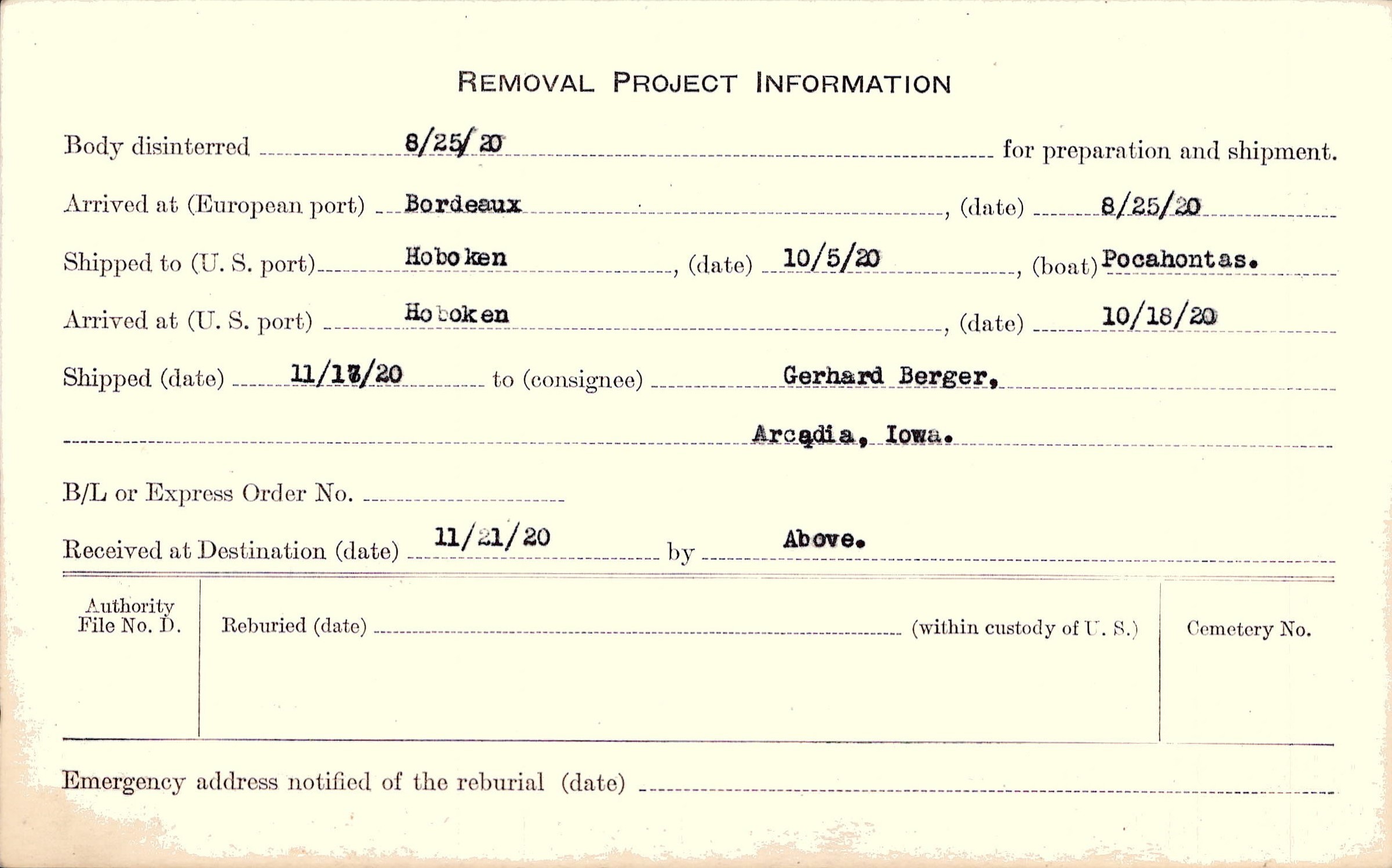 Body disinterred 8/25/1920 for preparation and shipment.