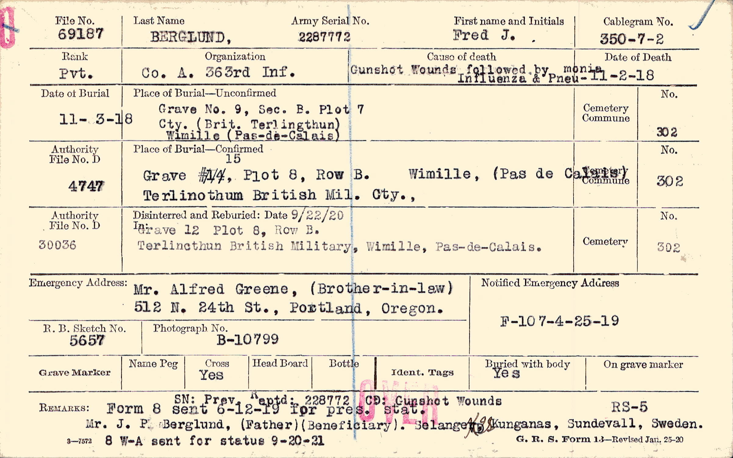 Body disinterred 8/26/1921 for preparation and shipment.