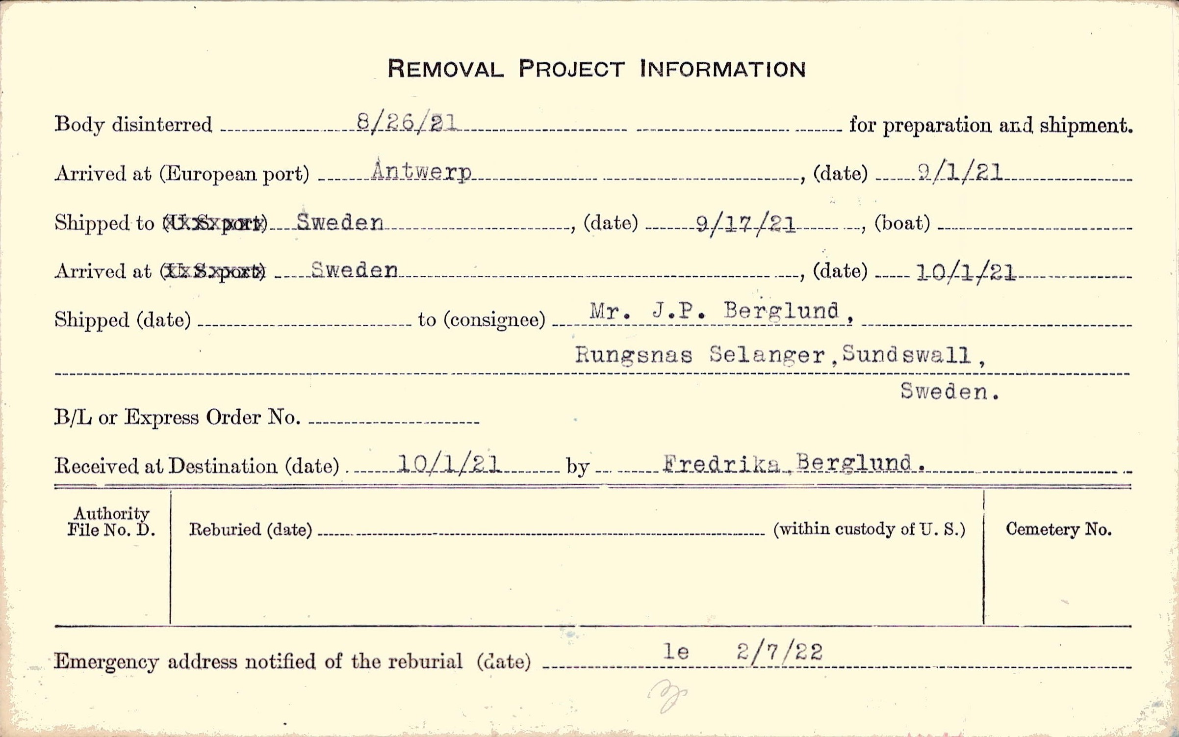 to Mr. J. P. Berglund, Rungsnas Selanger, Sundswall, Sweden.