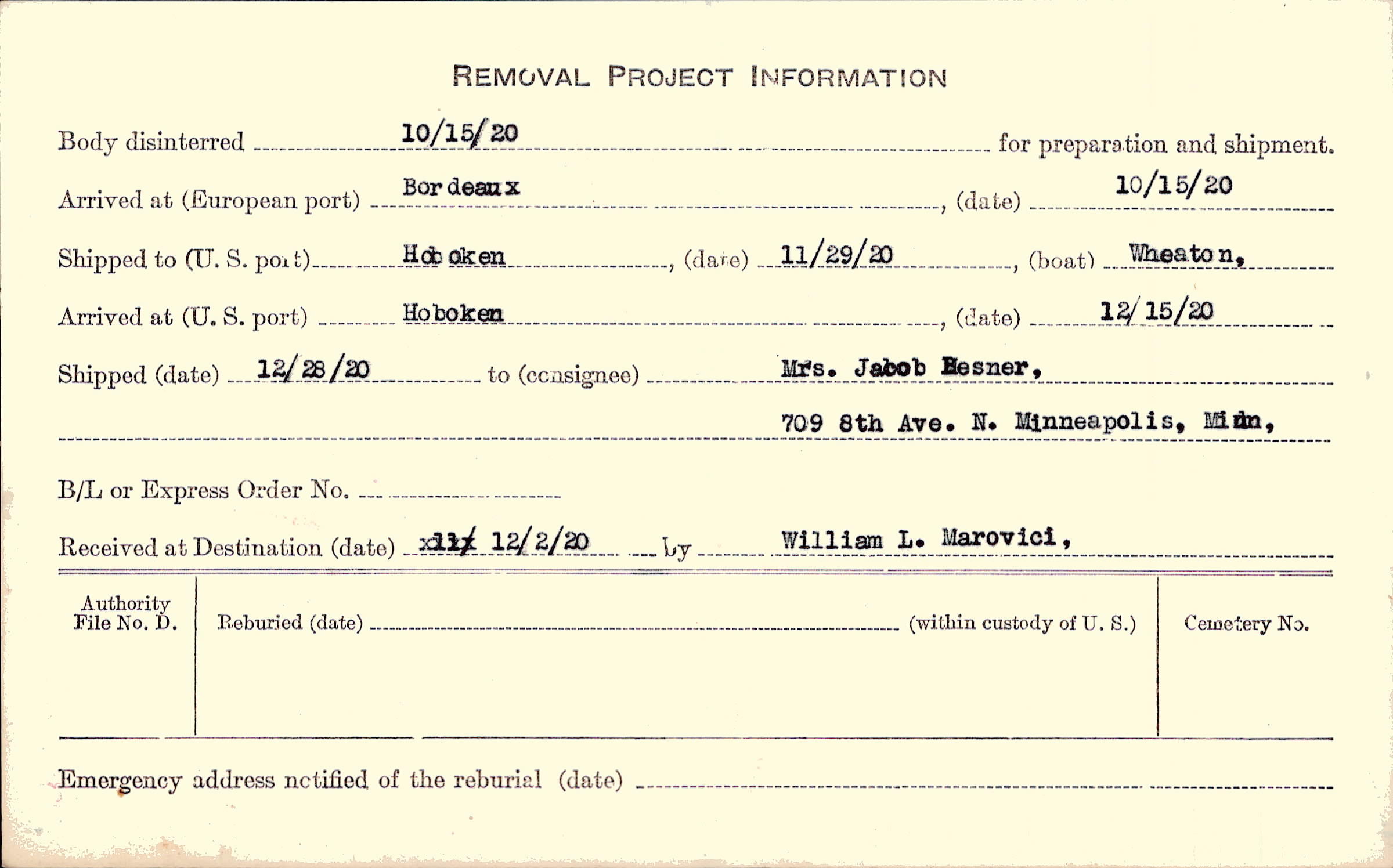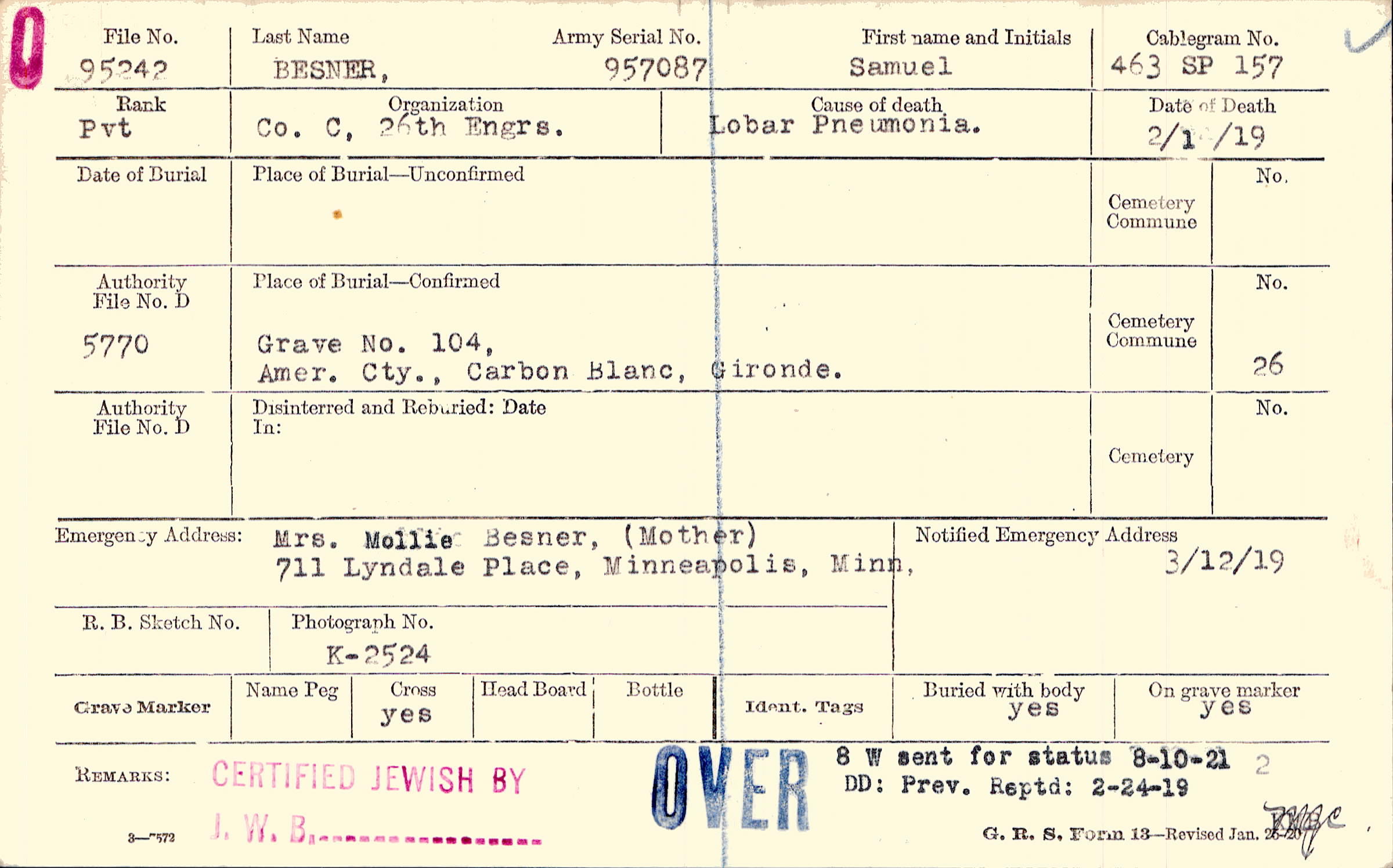 Mrs. Mollie Besner, (Mother), 711 Lyndale Place, Minneapolis, Minn.
