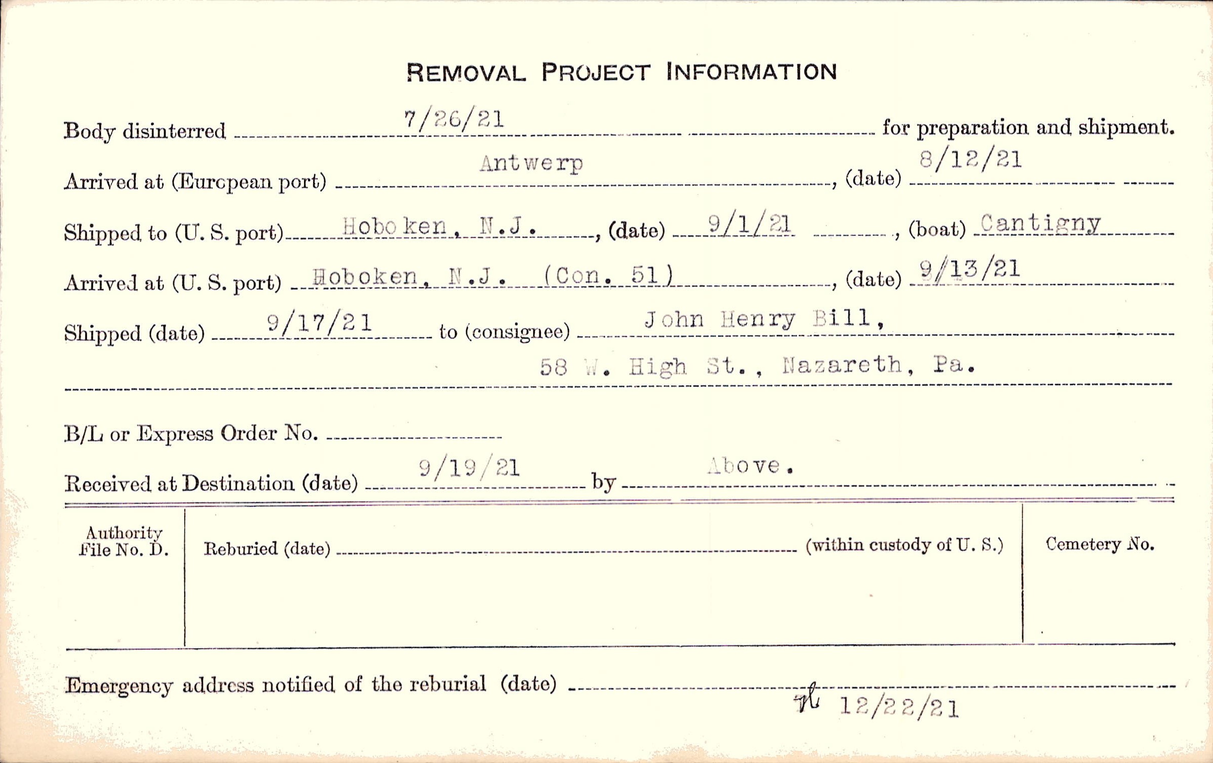 to John Henry Bill, 58 W. High St., Nazareth, Pa.