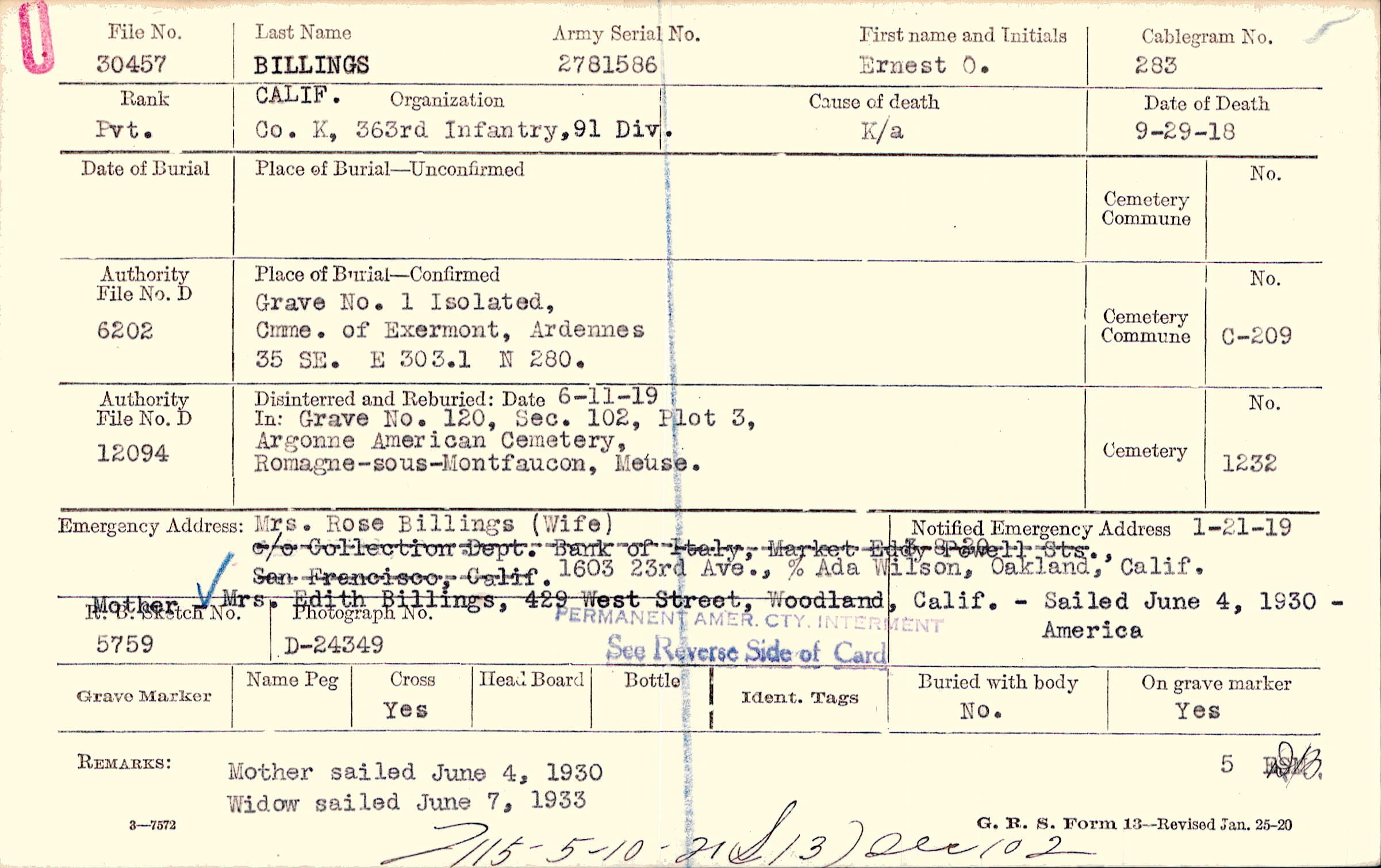Mrs. Rose Billings (Wife), 1603 23rd Ave., c/o Ada Wilson, Oakland, Calif., Mother - Mrs. Edith Billings, 429 West Street, Woodland, Calif. - Sailed June 4, 1930 - America