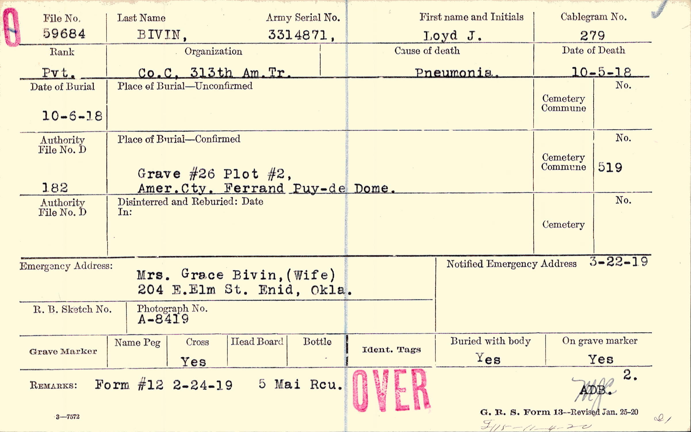 Mrs. Grace Bivin, (Wife), 204 E. Elm St., Enid, Okla