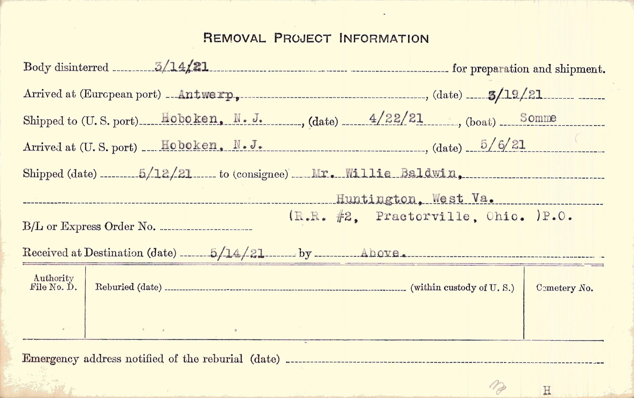to Mr. Willie Baldwin, Huntingdon, West Va. (R.R. #2, Practorville, Ohio. ) P.O.