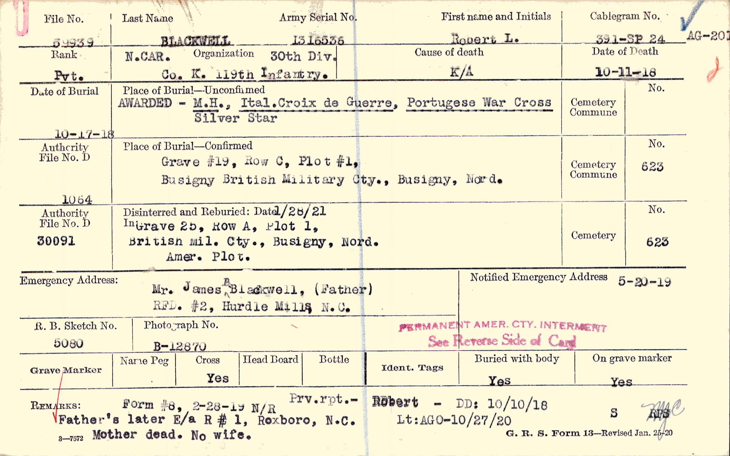 Grave #19, Row C, Plot #1, Busigny British Military Cty., Busigny, Nord.