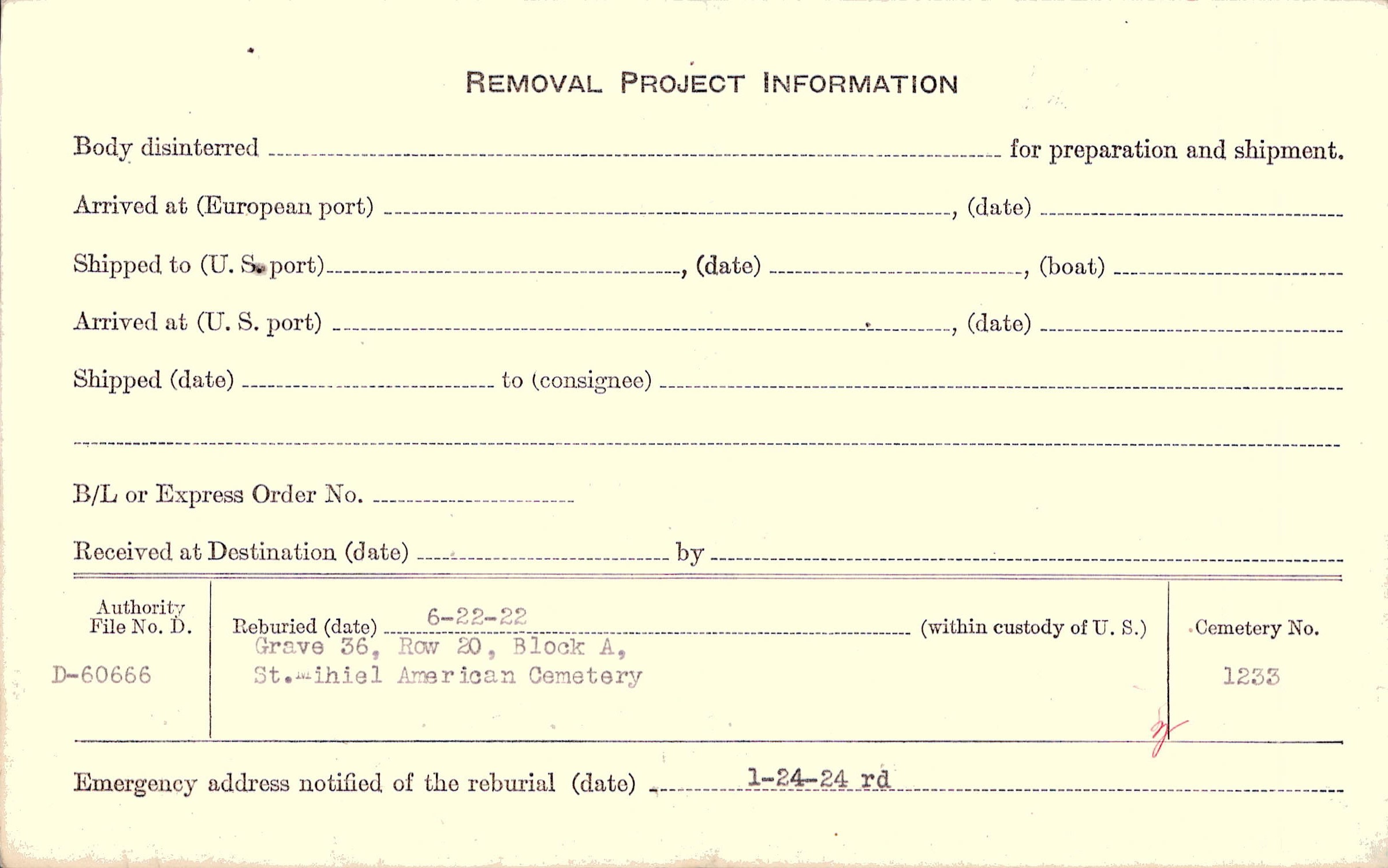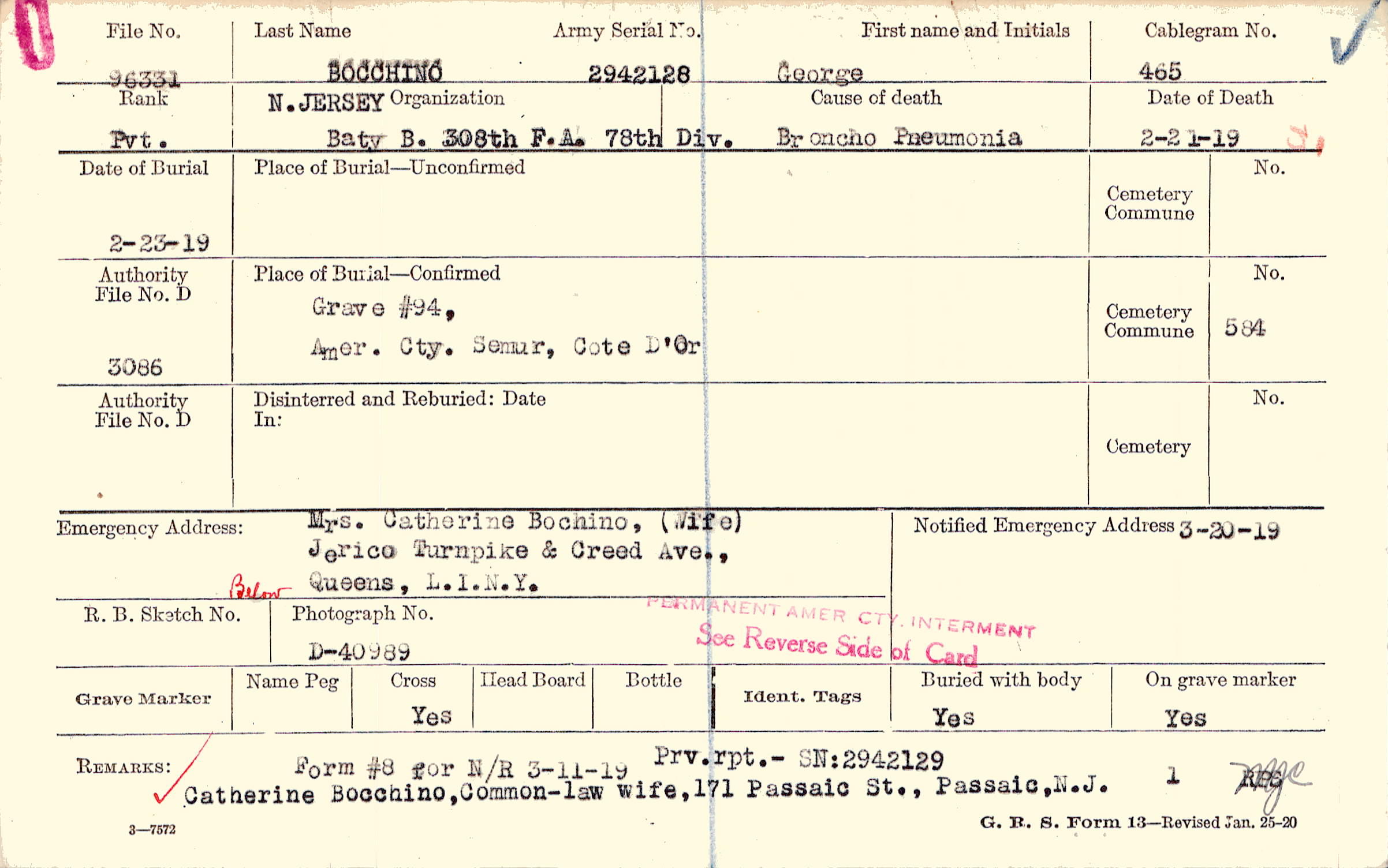 Mrs. Catherine Bochino, (Wife), Jerico Turnpike & Creed Ave., Queens, L.I.N.Y., Below Permanent Amer. Cty. Interment See Reverse Side of Card