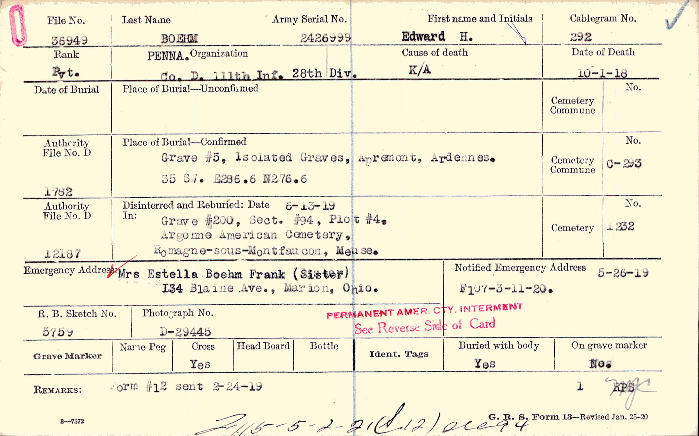 Mrs Estella Boehm Frank (Sister), 134 Blaine Ave., Marion, Ohio.