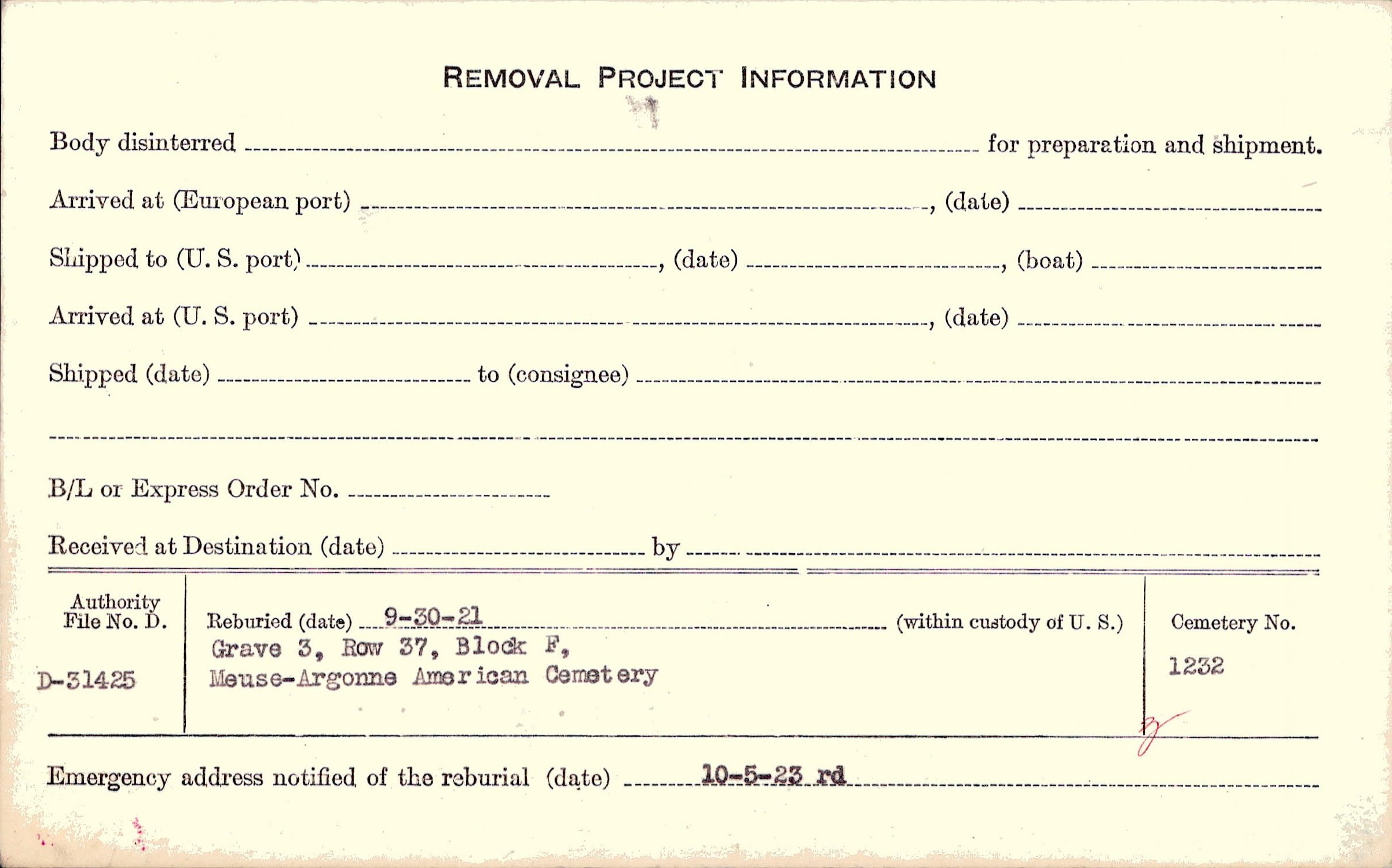 | Permanent Burial in Foreign Cemetery |