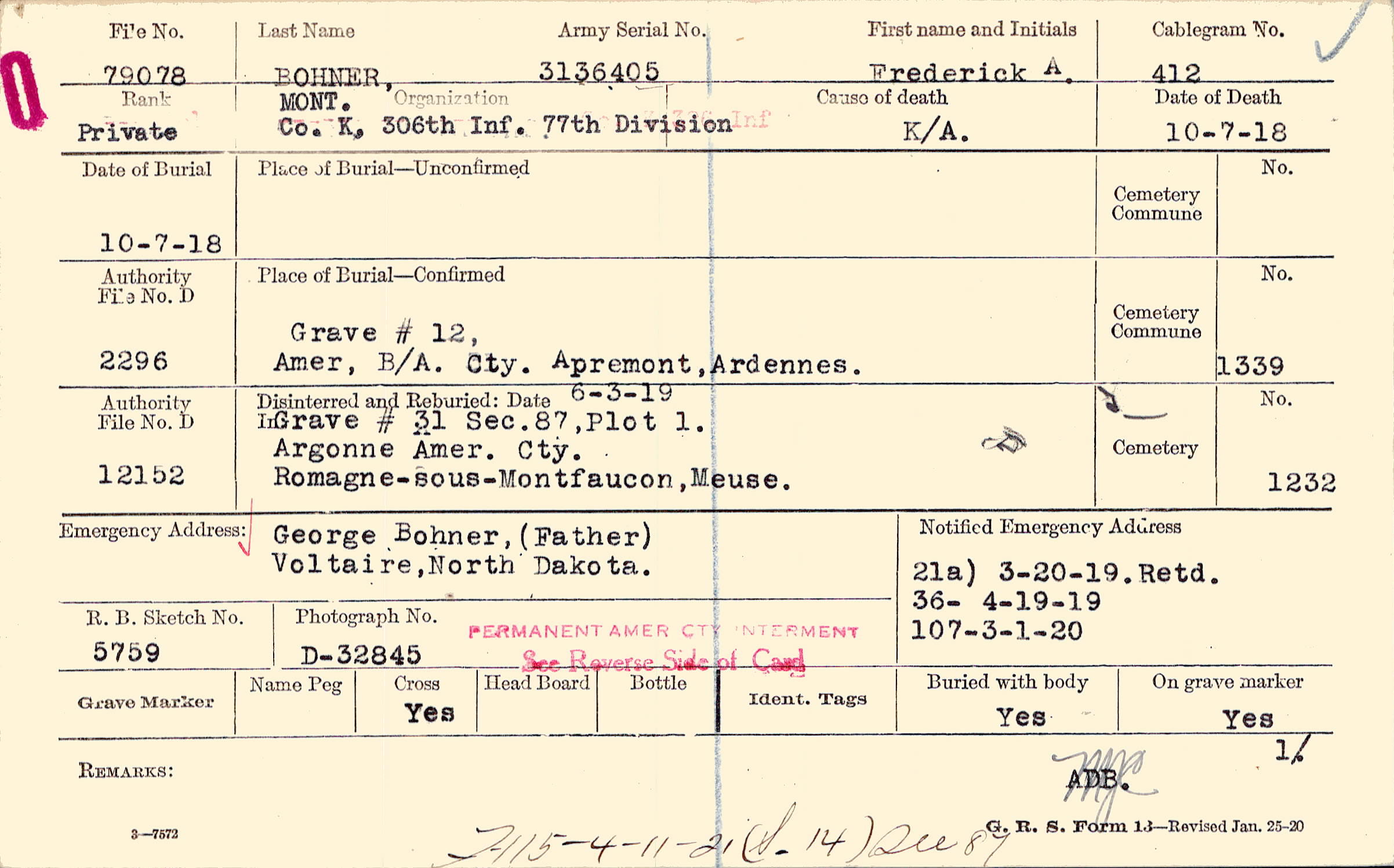 Grave #12, Amer, B/A. Cty. apremont, Ardennes.