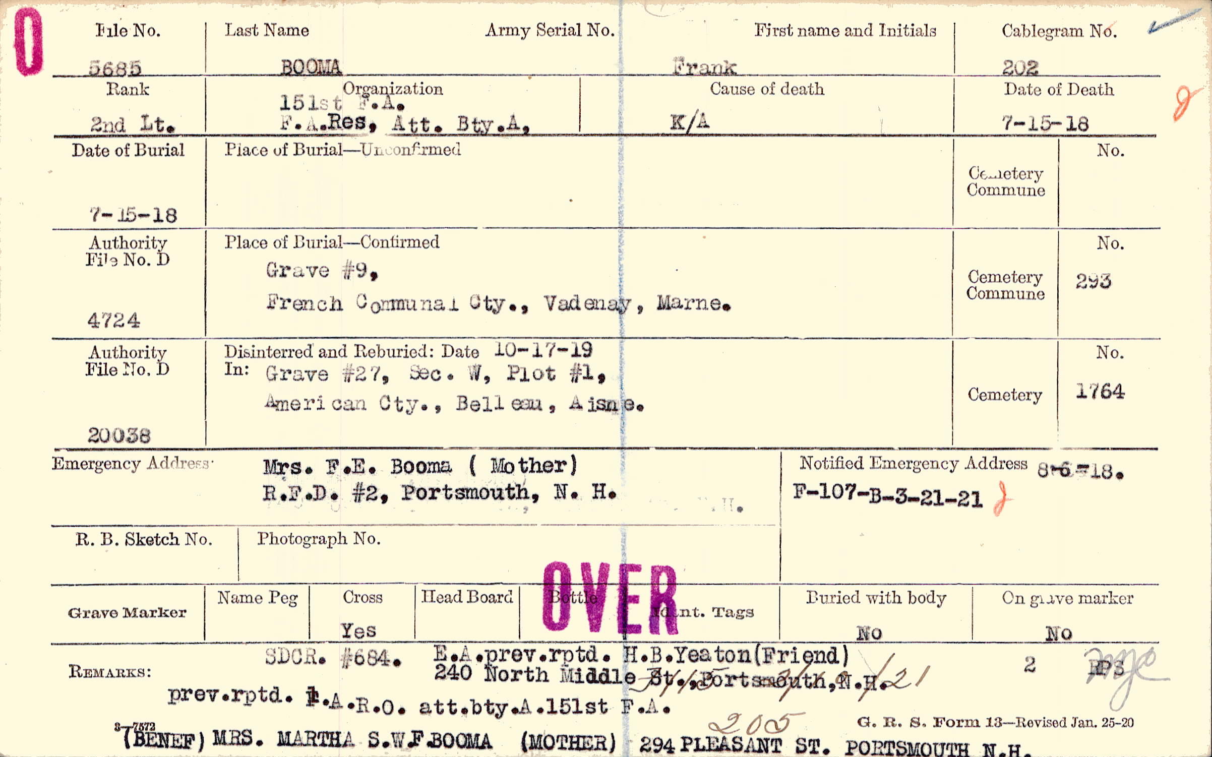 Mrs. F.E. Booma (Mother), R.F.D. #2, Portsmouth, N.H.