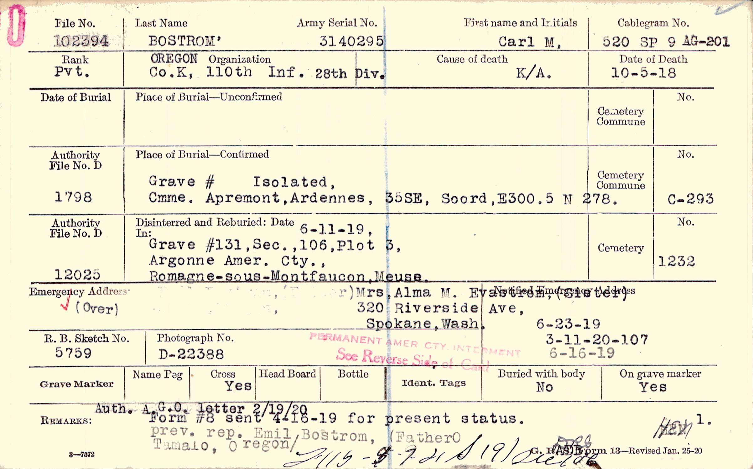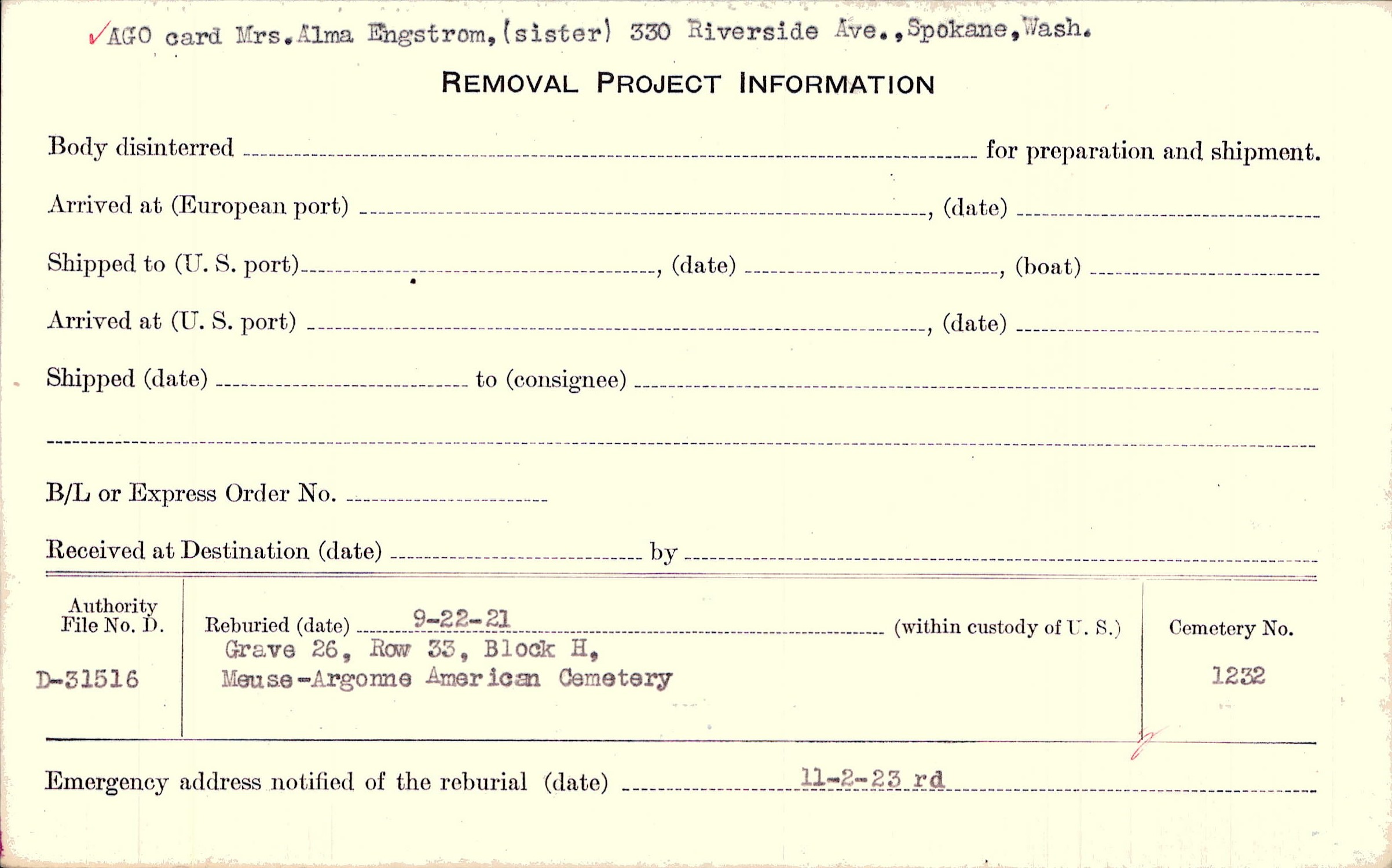 AGO card Mrs. Alma Engstrom, (sister) 330 Riverside Ave., Spokane, Wash. |