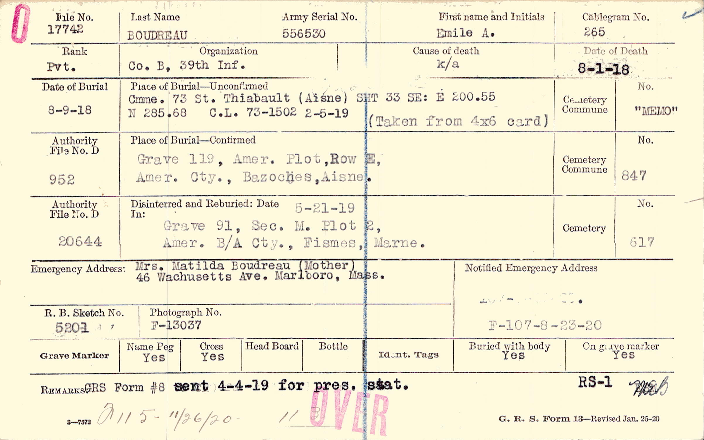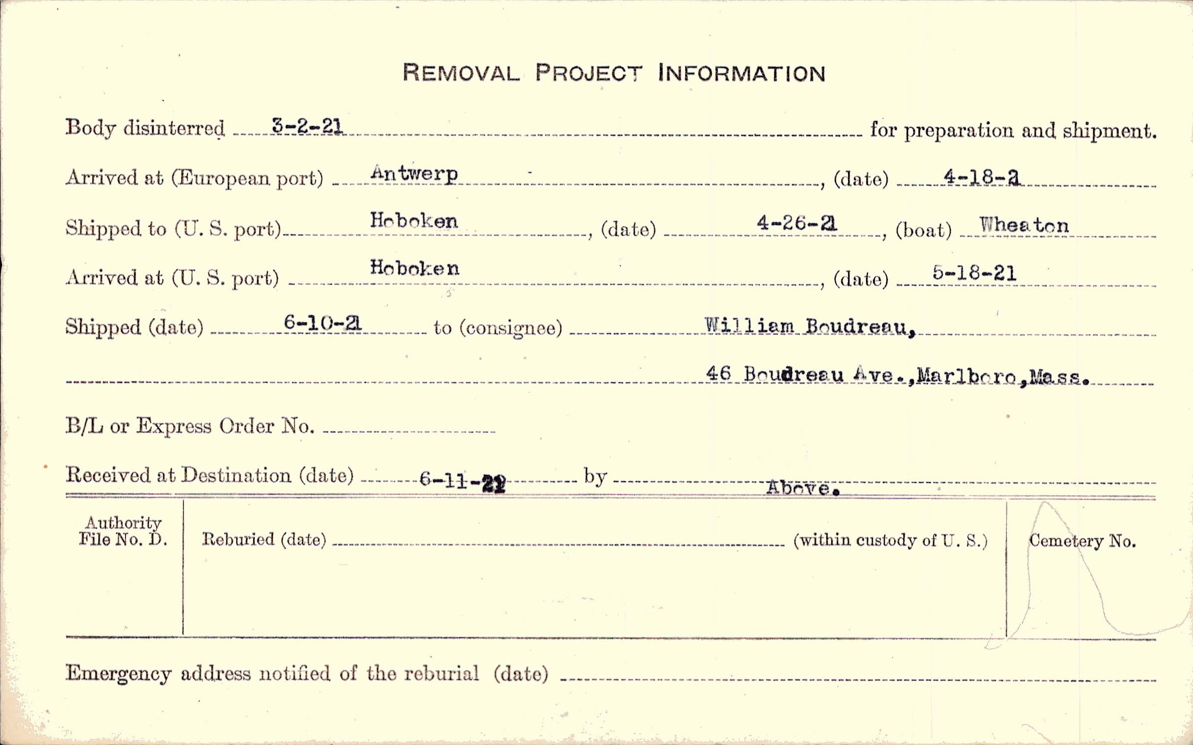 Mrs. Matilda Boudreau (Mother), 46 Wachusetts Ave. Marlboro, Mass.