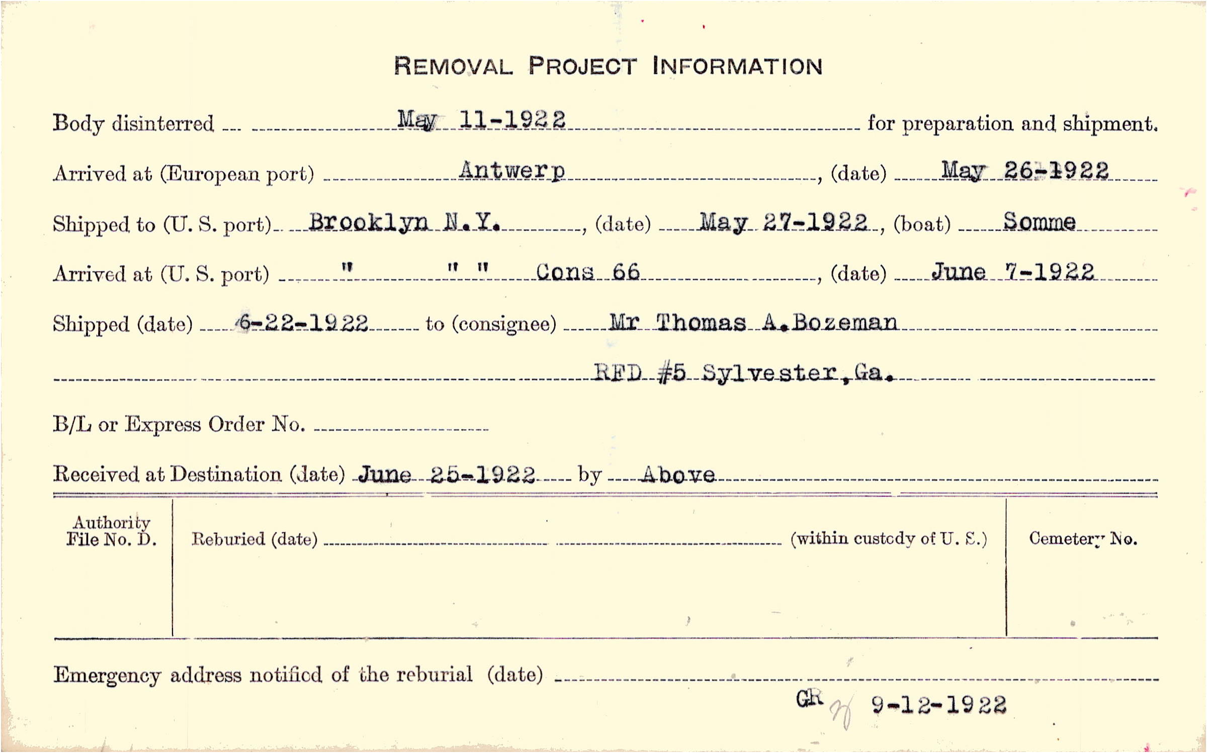 Mr. Thomas A. Bozeman (Father), RFD #5 Sylvester, Georgia.