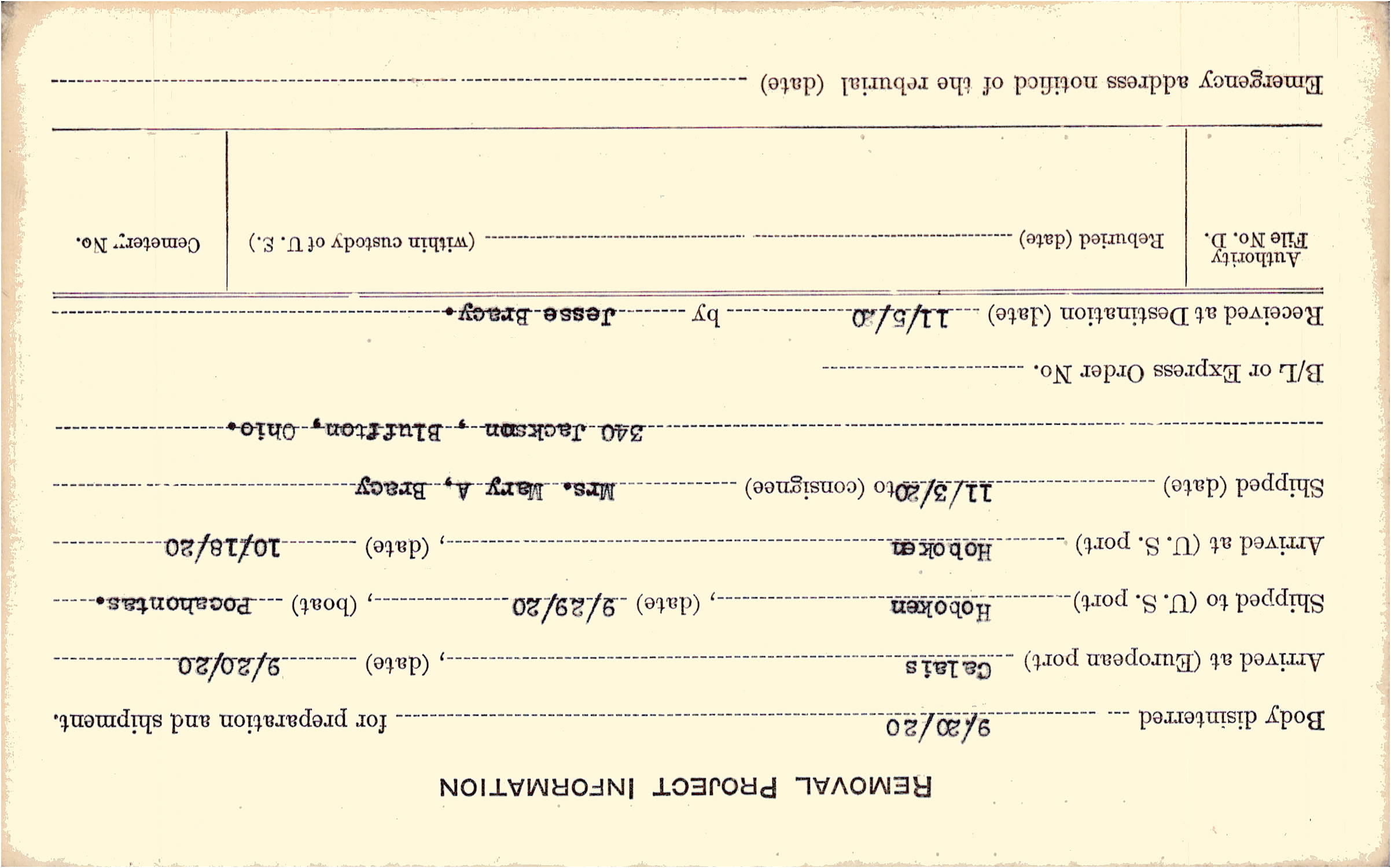 Body disinterred 9/20/1920 for preparation and shipment.
