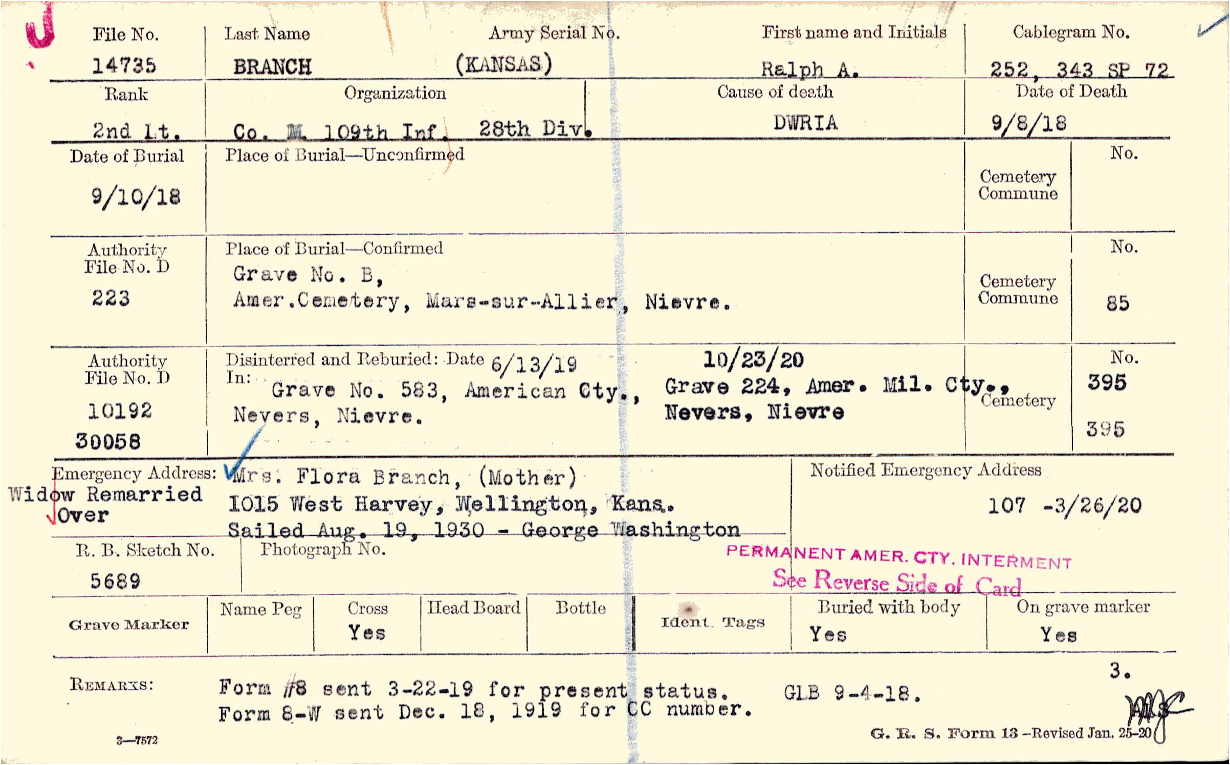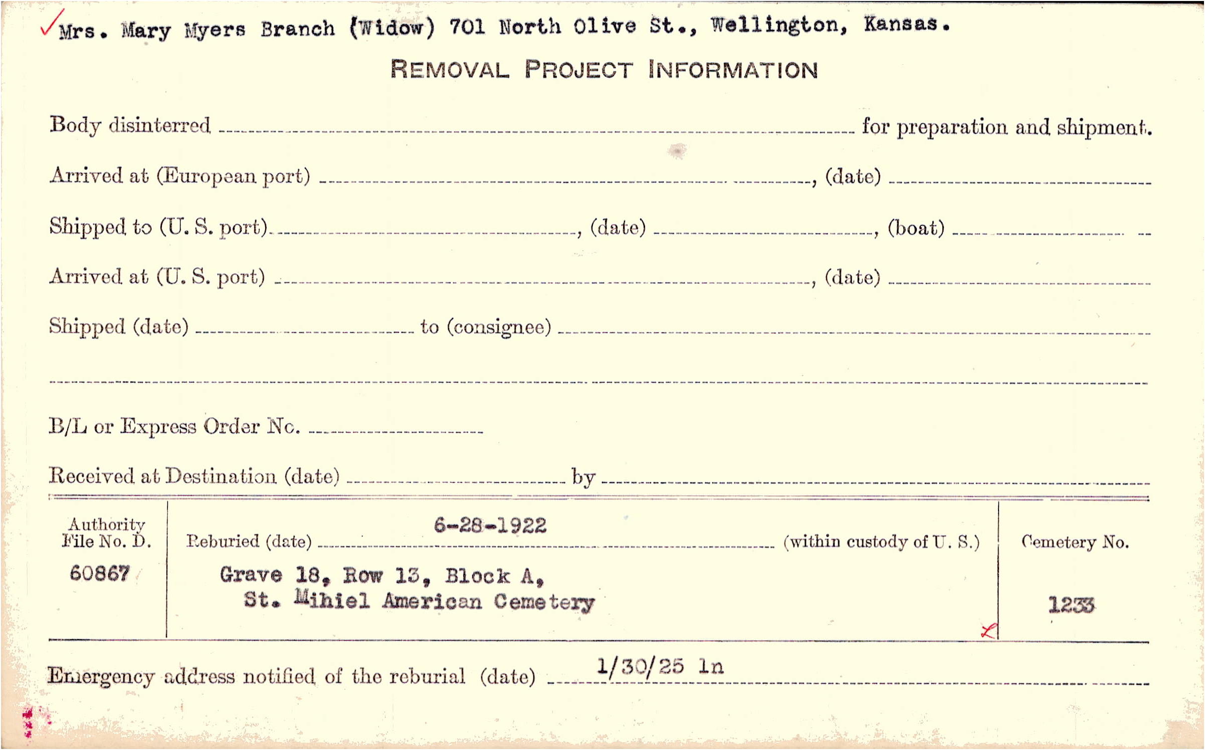 Mrs. Mary Myers Branch,(Widow), 701 North Olive St., Wellington, Kansas |