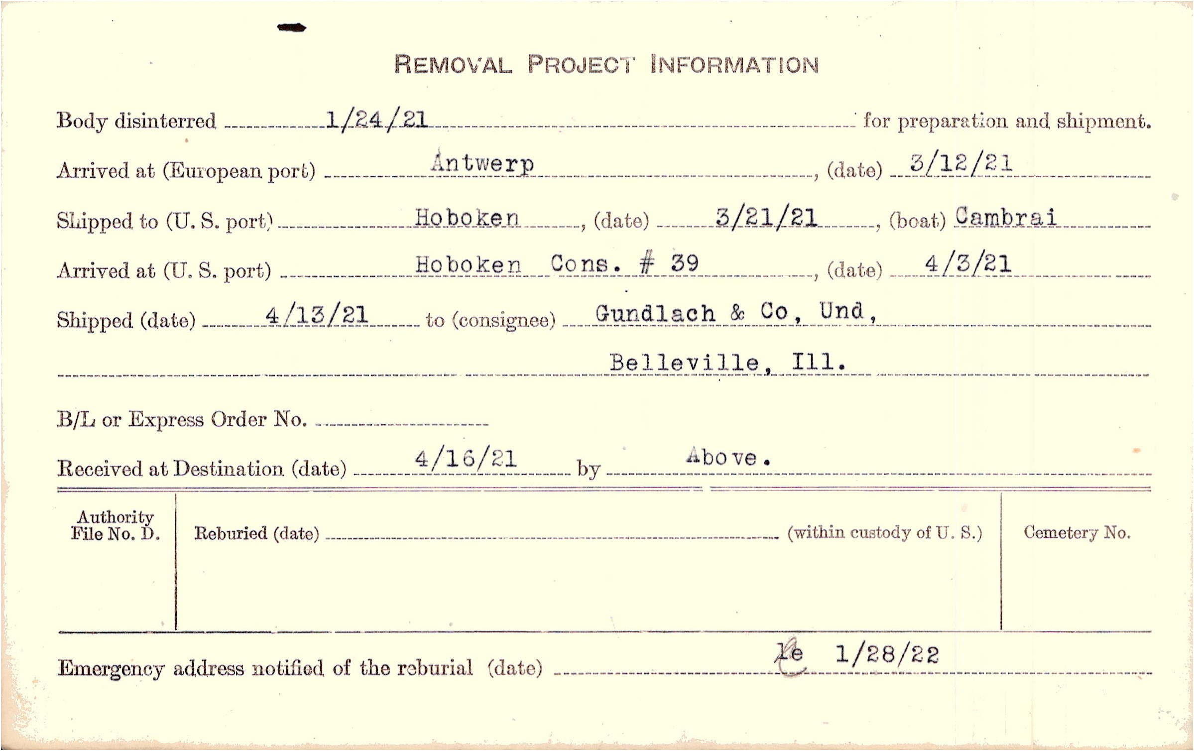 Body disinterred 1/24/1921 for preparation and shipment.