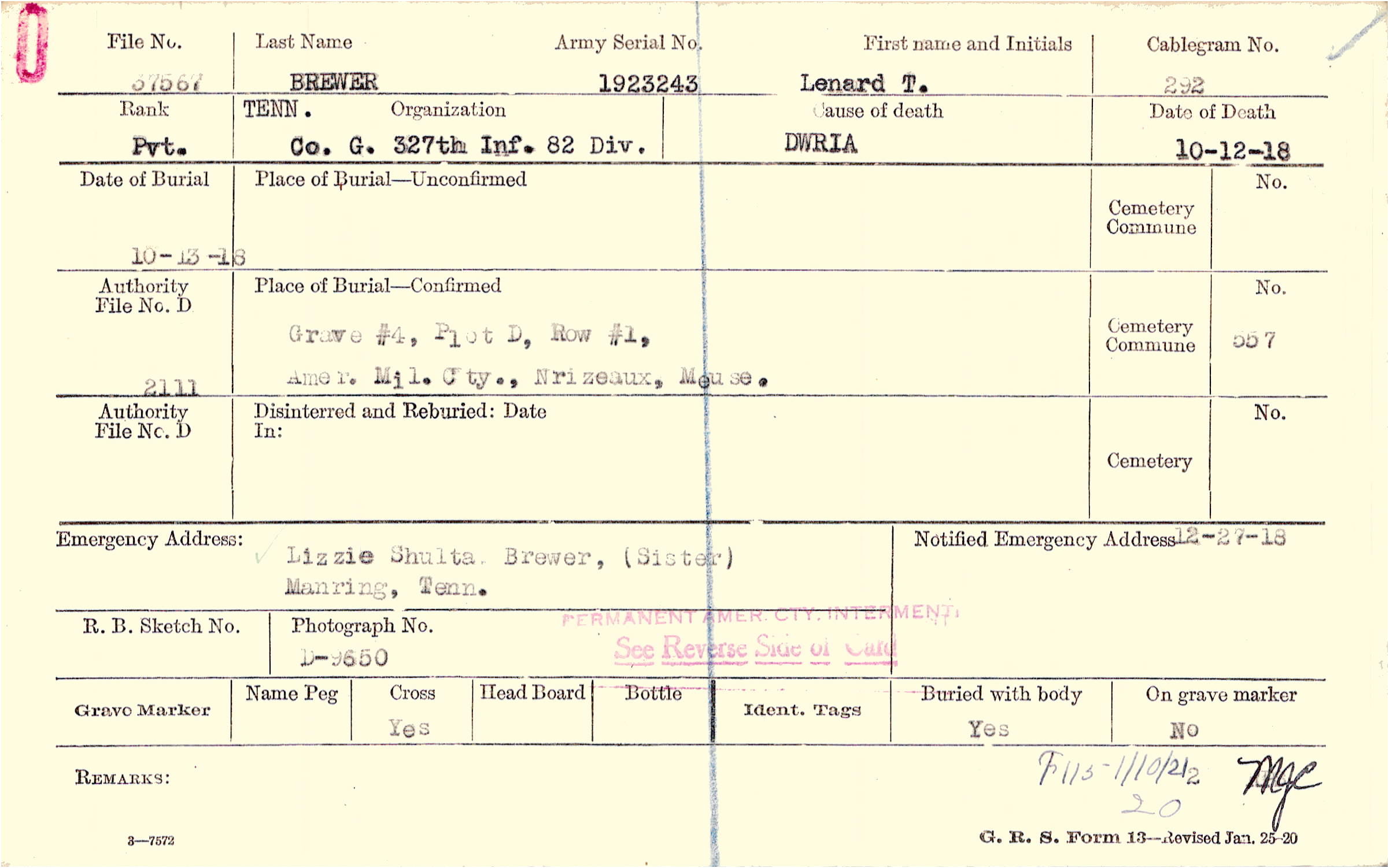 Grave #4, Plot D, Row #1, Amer. Mil. Cty., Nrizeaux, Meuse.