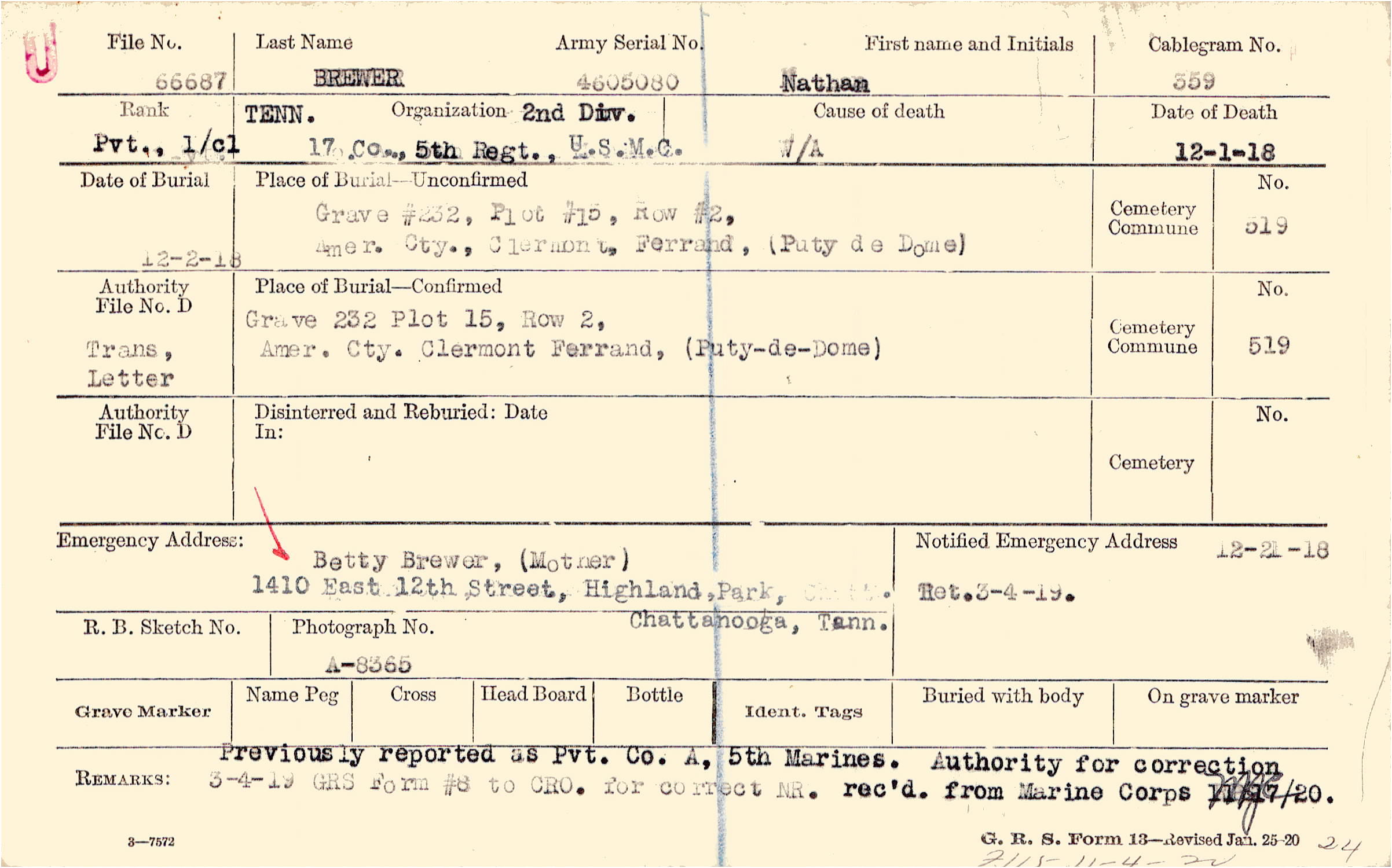 Previously reported as Pvt. Co.. A, 5th Marines. Authority for correction rec'd. from Marine Corps 11/17/20., 3-4-19 GRS Form #8 to CRO. for correct NR., F115 - 11-4-20