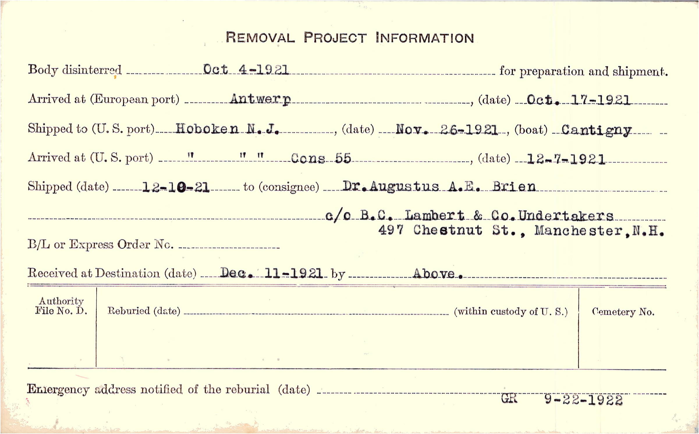 to Dr. Augustus A.E. Brien, c/o B.C. Lambert & Co. Undertakers, 497 Chestnut St., Manchester, N.H.