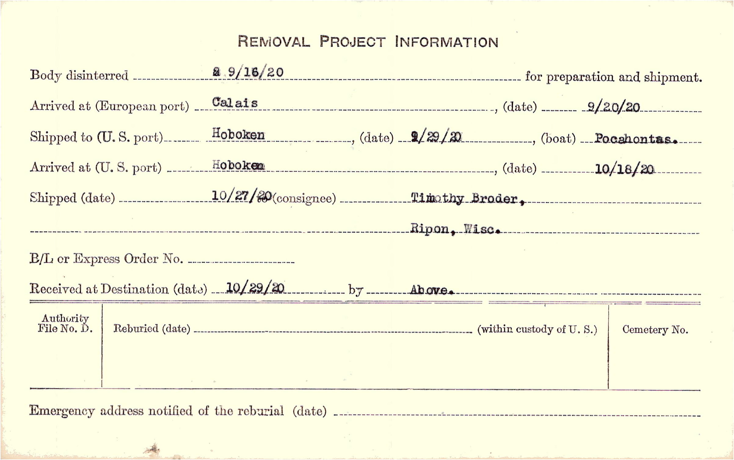 Body disinterred 9/16/1920 for preparation and shipment.