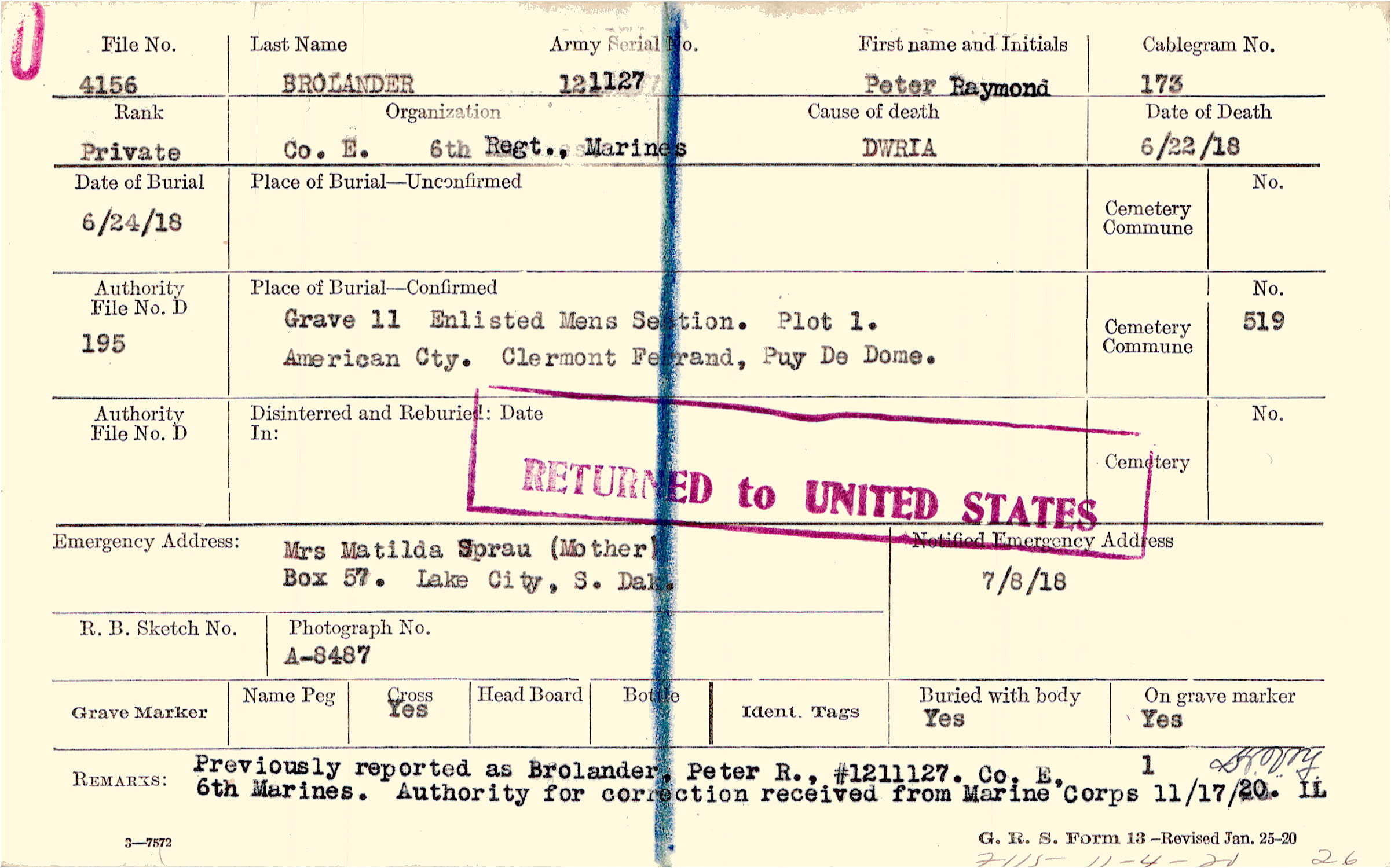 Previously reported as Brolander. Peter R., #1211127. Co. E, 1 6th Marines. Authority for correction received from Marine Corps 11/17/20. IL, F115 11-4-20 26