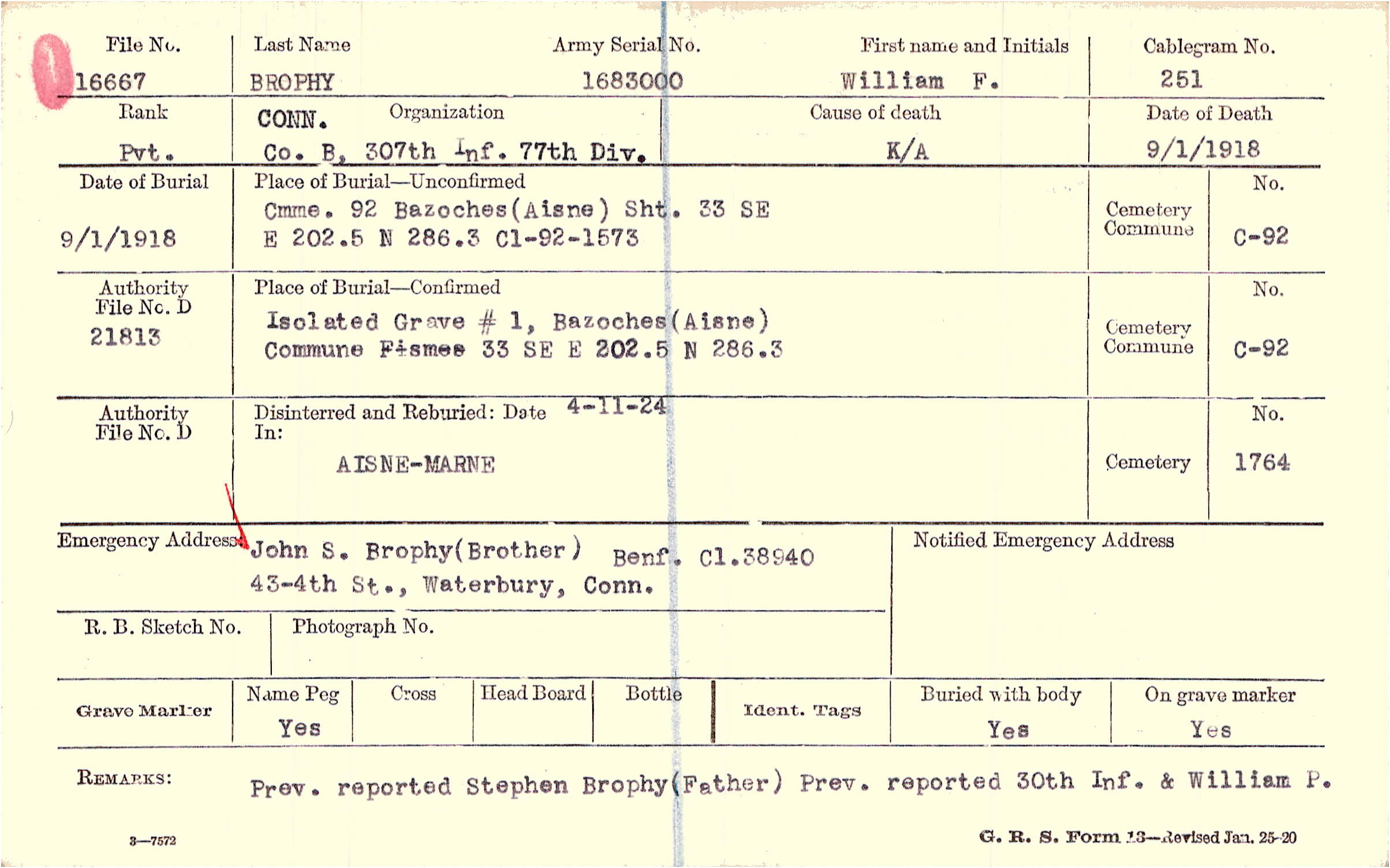 Prev. reported Stephen Brophy (Father) Prev. reported 30th Inf. & William P.