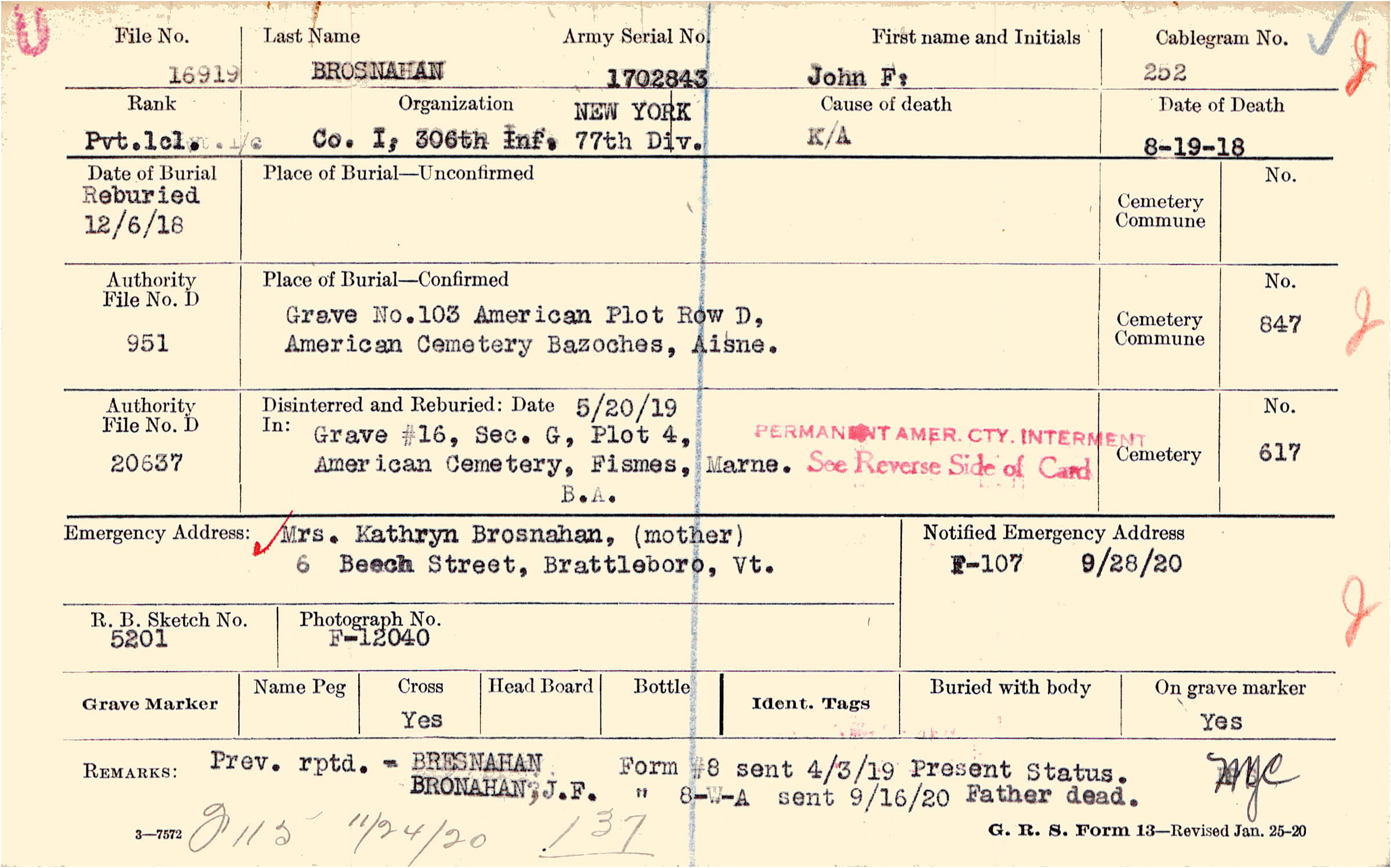 Mrs. Kathryn Brosnahan, (mother), 6 Beech Street, Brattleboro, Vt.