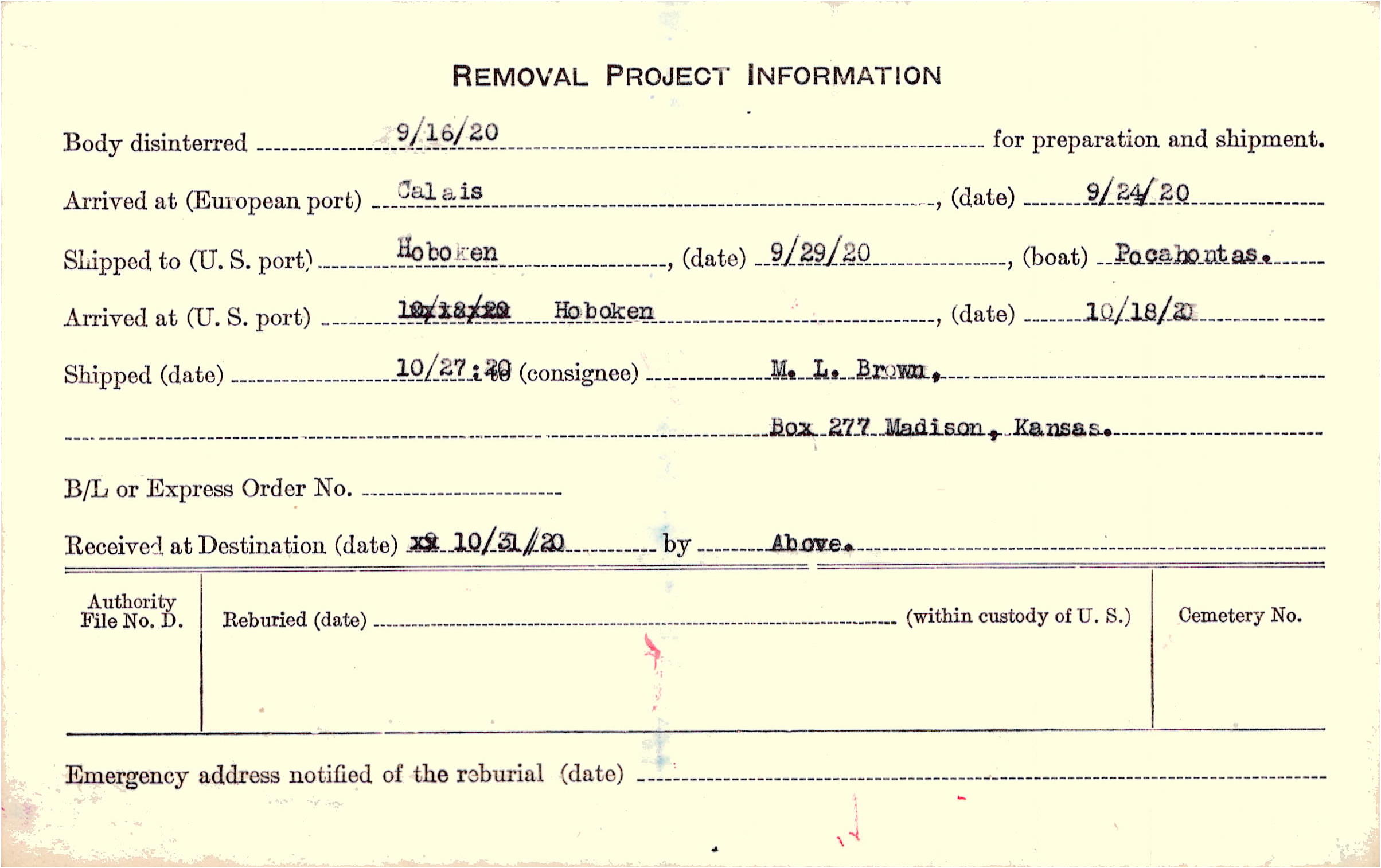 Body disinterred 9/16/1920 for preparation and shipment.