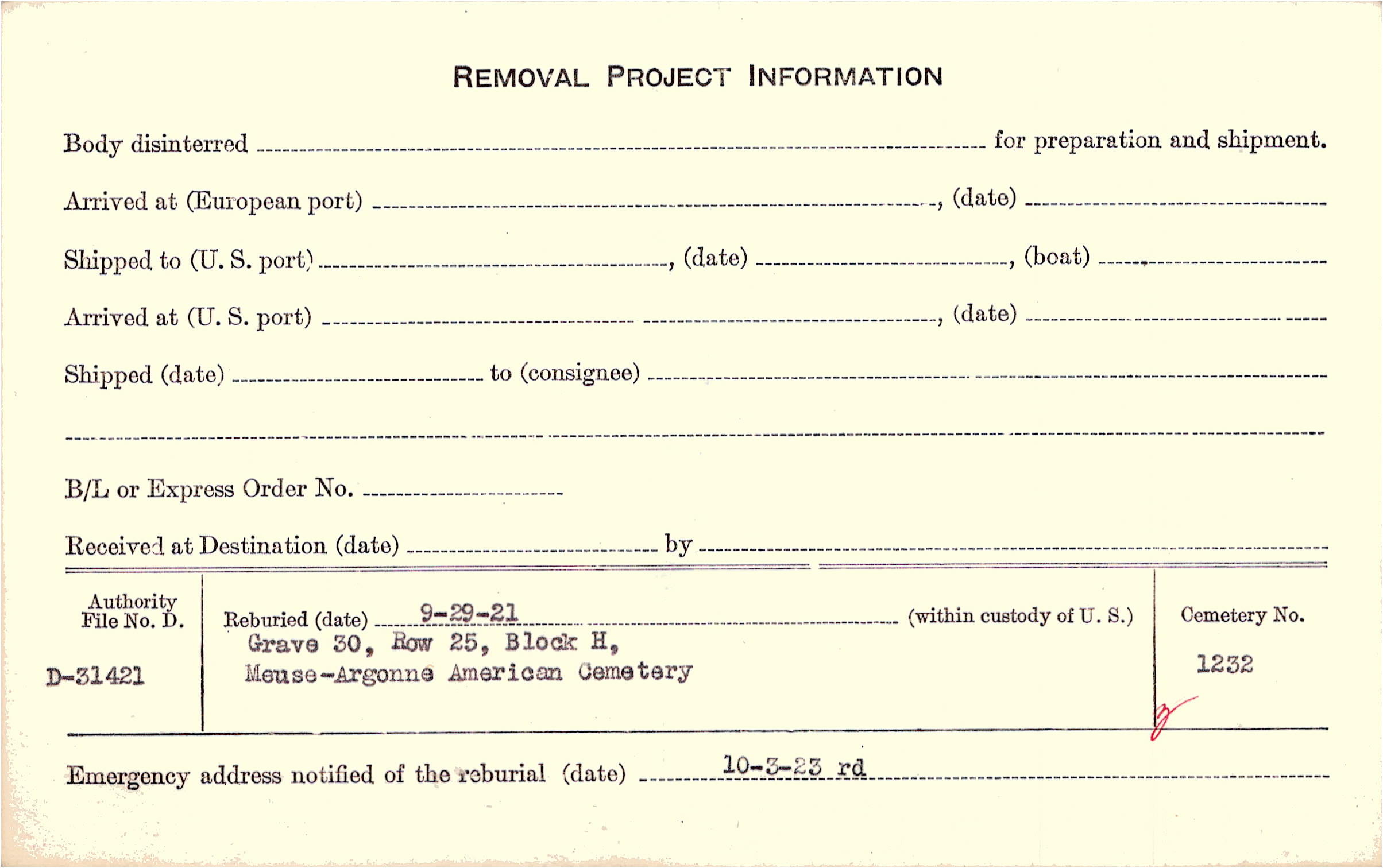 | Permanent Burial in Foreign Cemetery |