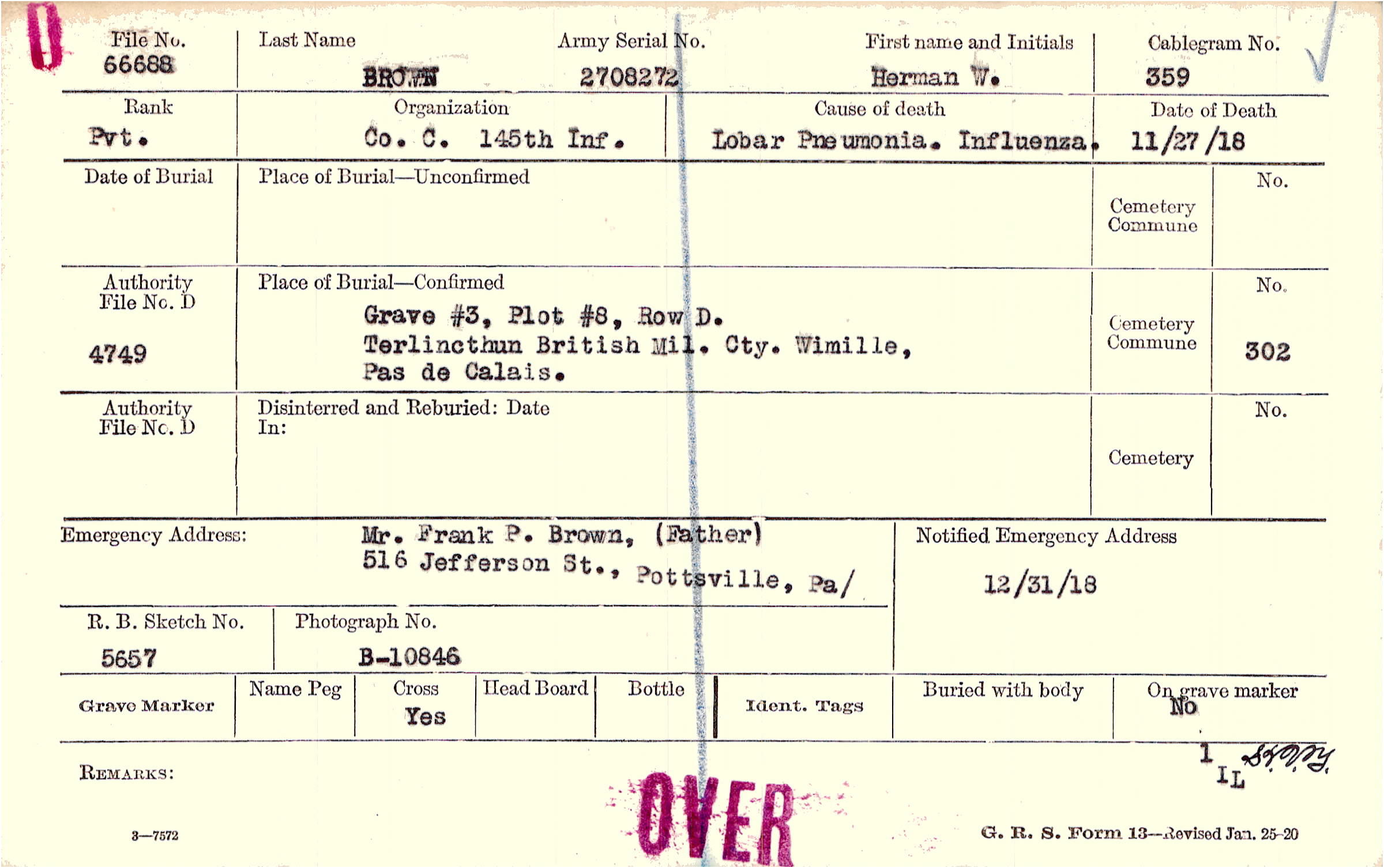 Mr. Frank P. Brown, (Father), 516 Jefferson St., Pottsville, Pa/