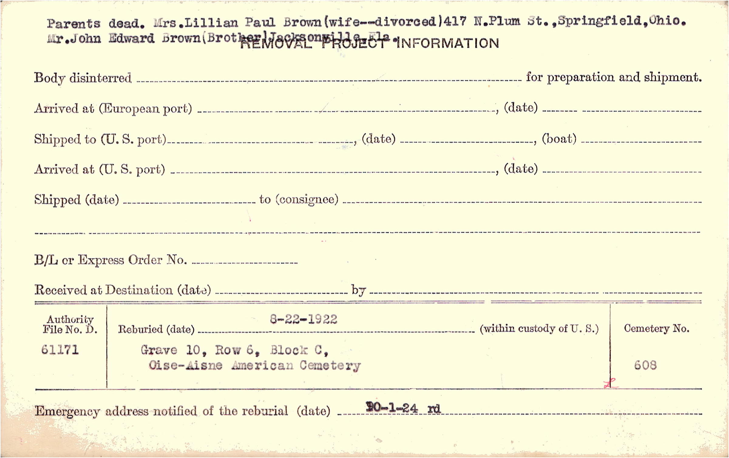 Parents dead. Mrs. Lilian Paul Brown (wife--divorced) 417 N. Plum St., Springfield, Ohio. Mr. John Edward Brown (Brother) Jacksonville, Fla. |