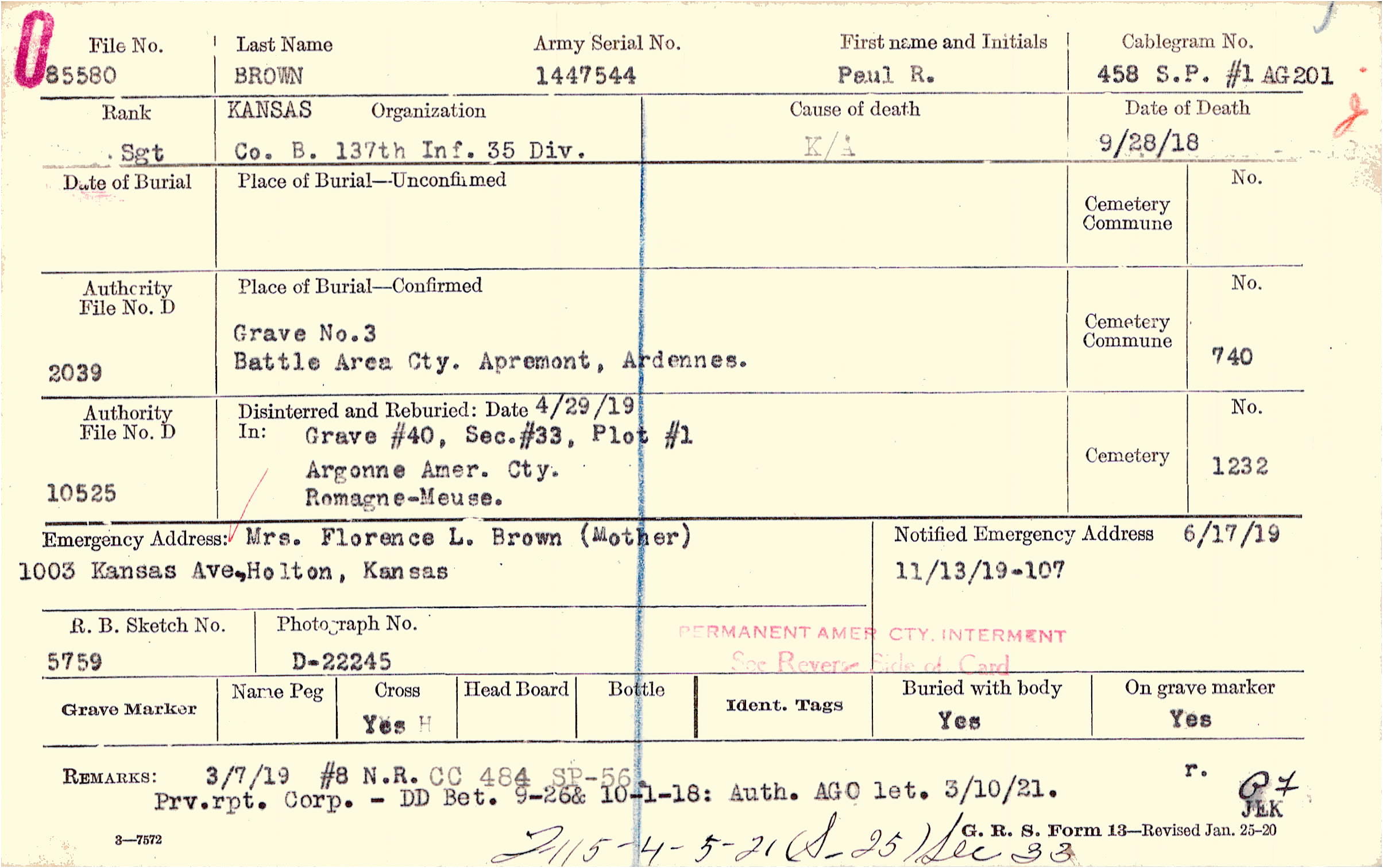 Mrs. Florence L. Brown (Mother), 1003 Kansas Ave., Holton, Kansas