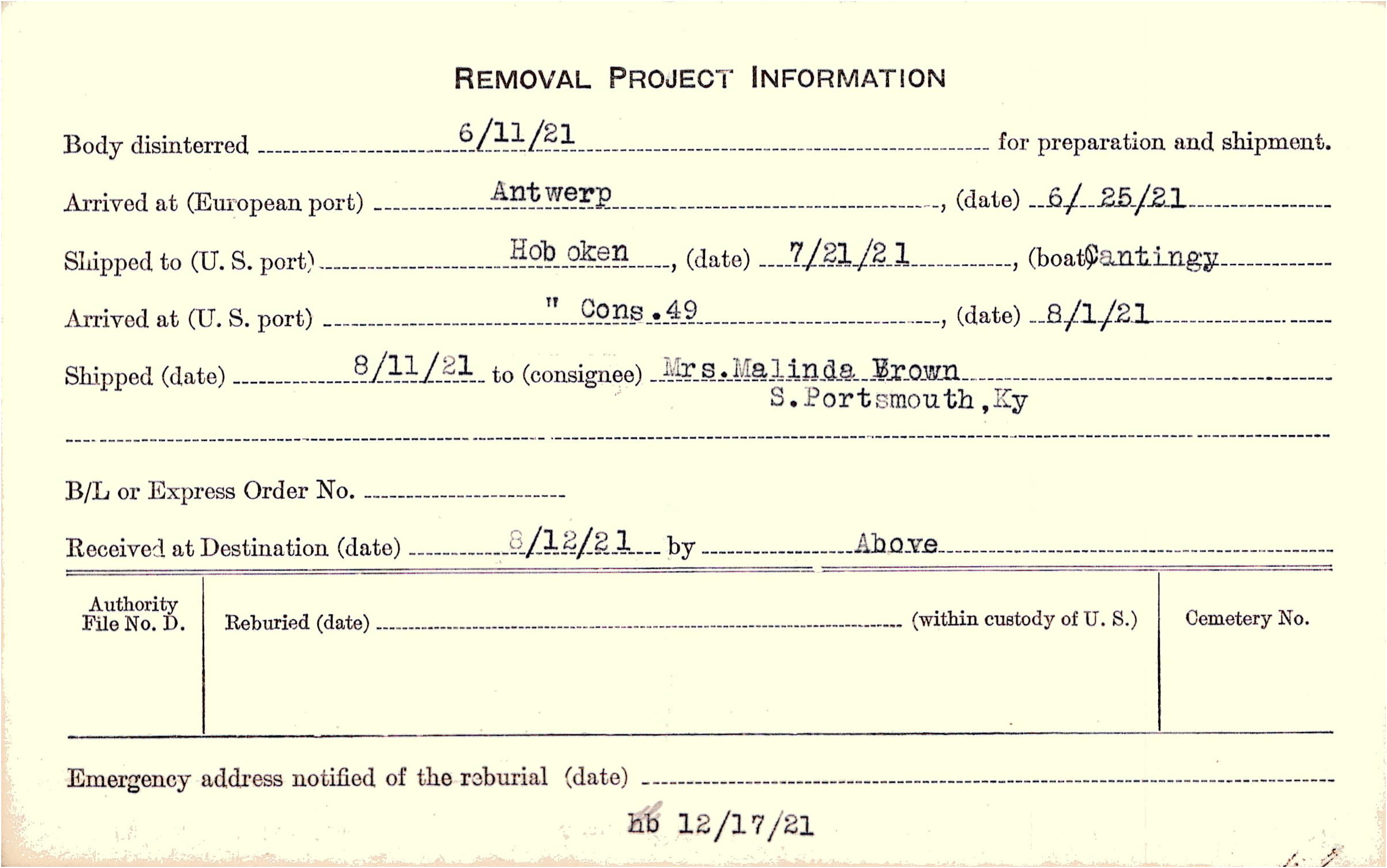 Body disinterred 6/11/1921 for preparation and shipment.