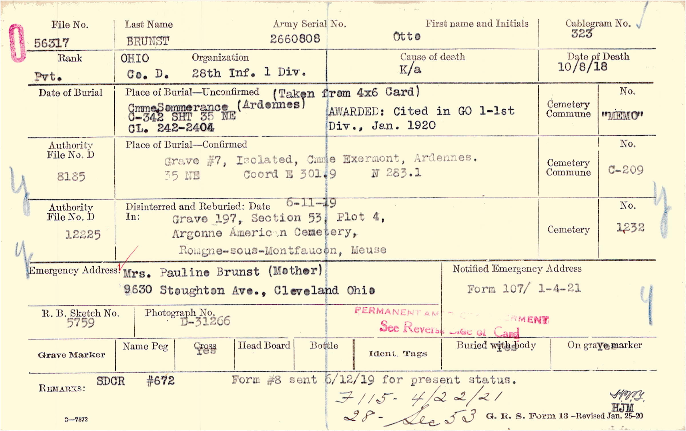 Cmme.Sommerance, Ardennes, C-342, SHT 35 NE, CL. 242-2404, AWARDED: Cited in GO 1-1st Div., Jan. 1920