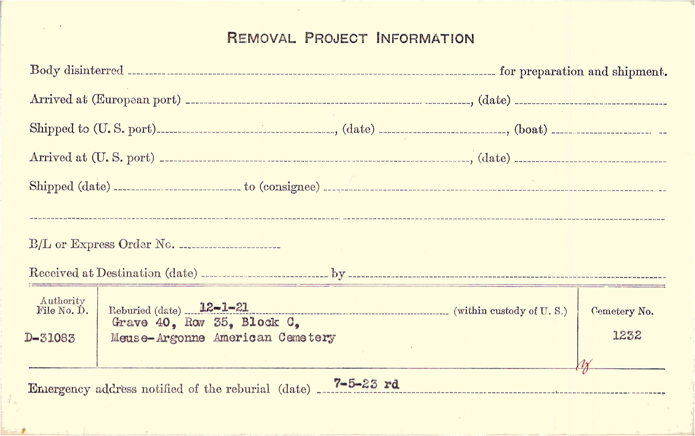 | Permanent Burial in Foreign Cemetery |