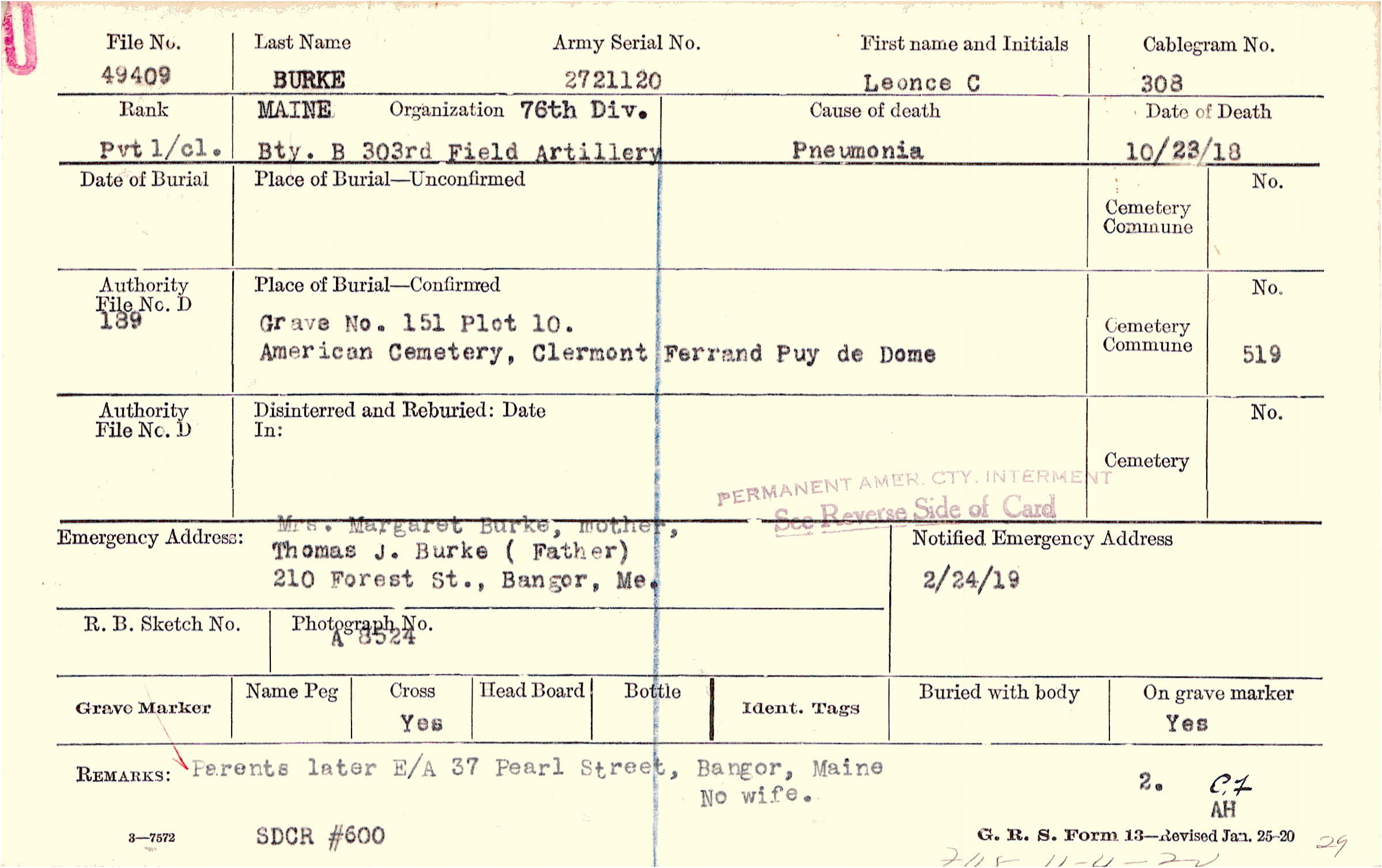 Mrs. Margaret Burke, mother,, 210 Forest St., Bangor, Me., Thomas J. Burke (Father)