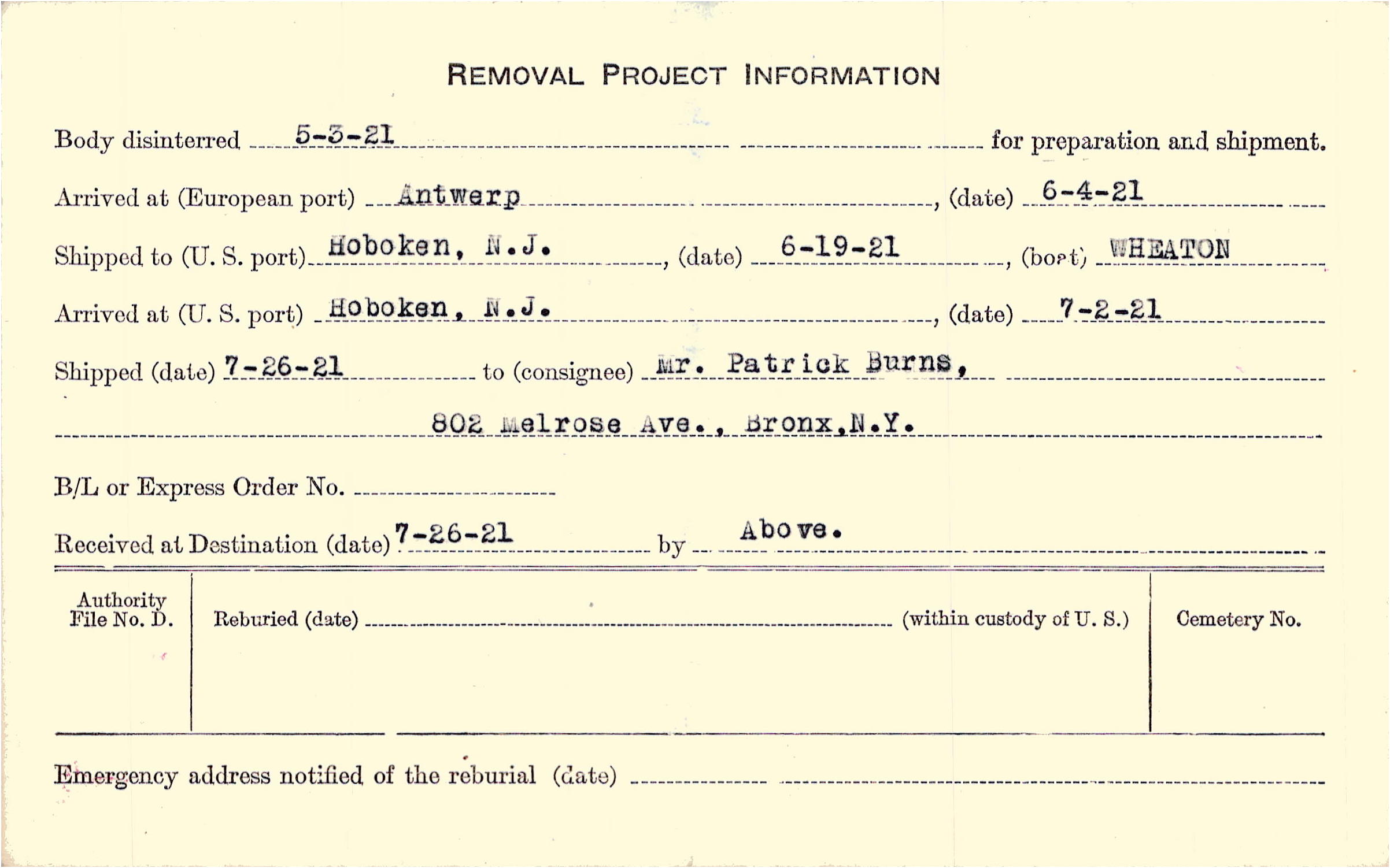 Patrick Burns, (Father), 802 Melrose Ave., New York City.